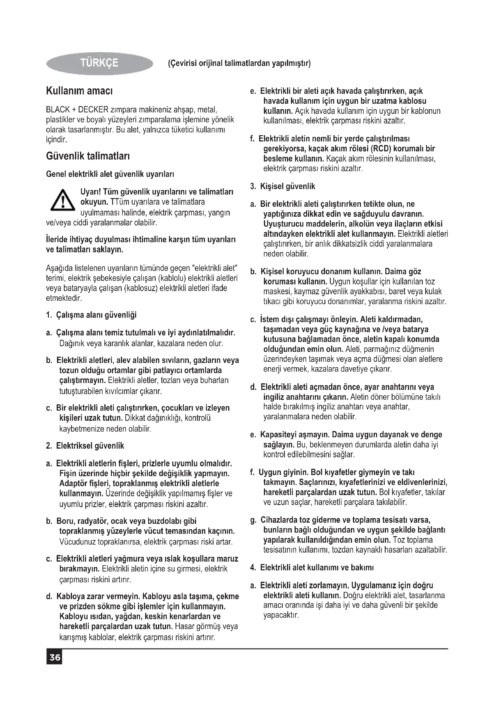 (Çevirisi orijinal talimatlardan yapılmıştır) Kullanım amacı BLACK + DECKER zımpara makineniz ahşap, metal, plastikler ve boyalı yüzeyleri zımparalama işlemine yönelik olarak tasarlanmıştır. Bu alet, yalnızca tüketici kullanımı içindir. Güvenlik talimatları Genel elektrikli alet güvenlik uyarıları Uyarı! Tüm güvenlik uyarılarını ve talimatları okuyun. TTüm uyarılara ve talimatlara uyulmaması halinde, elektrik çarpması, yangın ve/veya ciddi yaralanmalar olabilir. İleride ihtiyaç duyulması ihtimaline karşın tüm uyarıları ve talimatları saklayın. Aşağıda listelenen uyarıların tümünde geçen "elektrikli alet" terimi, elektrik şebekesiyle çalışan (kablolu) elektrikli aletleri veya bataryayla çalışan (kablosuz) elektrikli aletleri ifade etmektedir.
