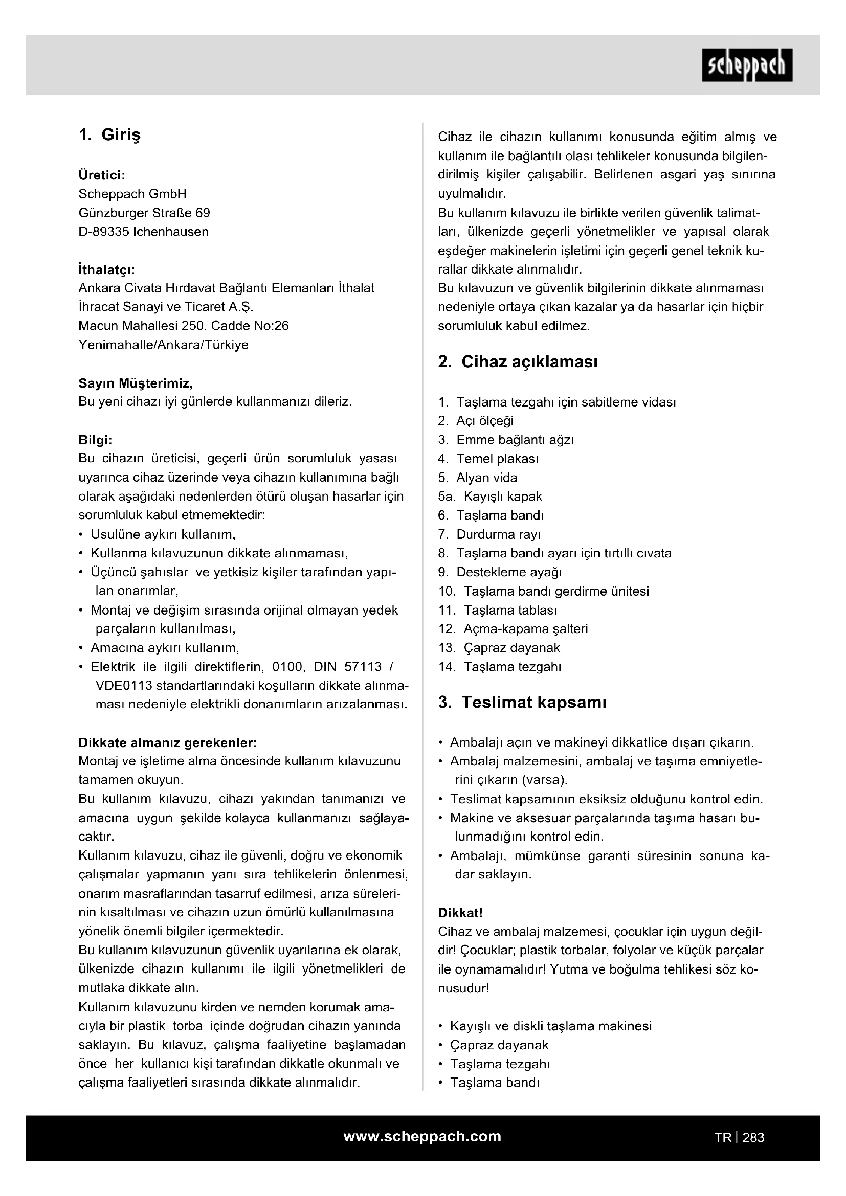 - Elektrik ile ilgili direktierin, 0100, DIN 57113 / VDE0113 standartlarındaki koşulların dikkate alınma- ması nedeniyle elektrikli donanımların arızalanması. Dikkate almanız gerekenler: Montaj ve işletime alma öncesinde kullanım kılavuzunu tamamen okuyun. Bu kullanım kılavuzu, cihazı yakından tanımanızı ve amacına uygun şekilde kolayca kullanmanızı sağlaya- caktır. Kullanım kılavuzu, cihaz ile güvenli, doğru ve ekonomik çalışmalar yapmanın yanı sıra tehlikelerin önlenmesi, onarım masraarından tasarruf edilmesi, arıza süreleri- nin kısaltılması ve cihazın uzun ömürlü kullanılmasına yönelik önemli bilgiler içermektedir. Bu kullanım kılavuzunun güvenlik uyarılarına ek olarak, ülkenizde cihazın kullanımı ile ilgili yönetmelikleri de mutlaka dikkate alın. Kullanım kılavuzunu kirden ve nemden korumak ama- cıyla bir plastik torba içinde doğrudan cihazın yanında saklayın. Bu kılavuz, çalışma faaliyetine başlamadan önce her kullanıcı kişi tarafından dikkatle okunmalı ve çalışma faaliyetleri sırasında dikkate alınmalıdır.www.scheppach.com
