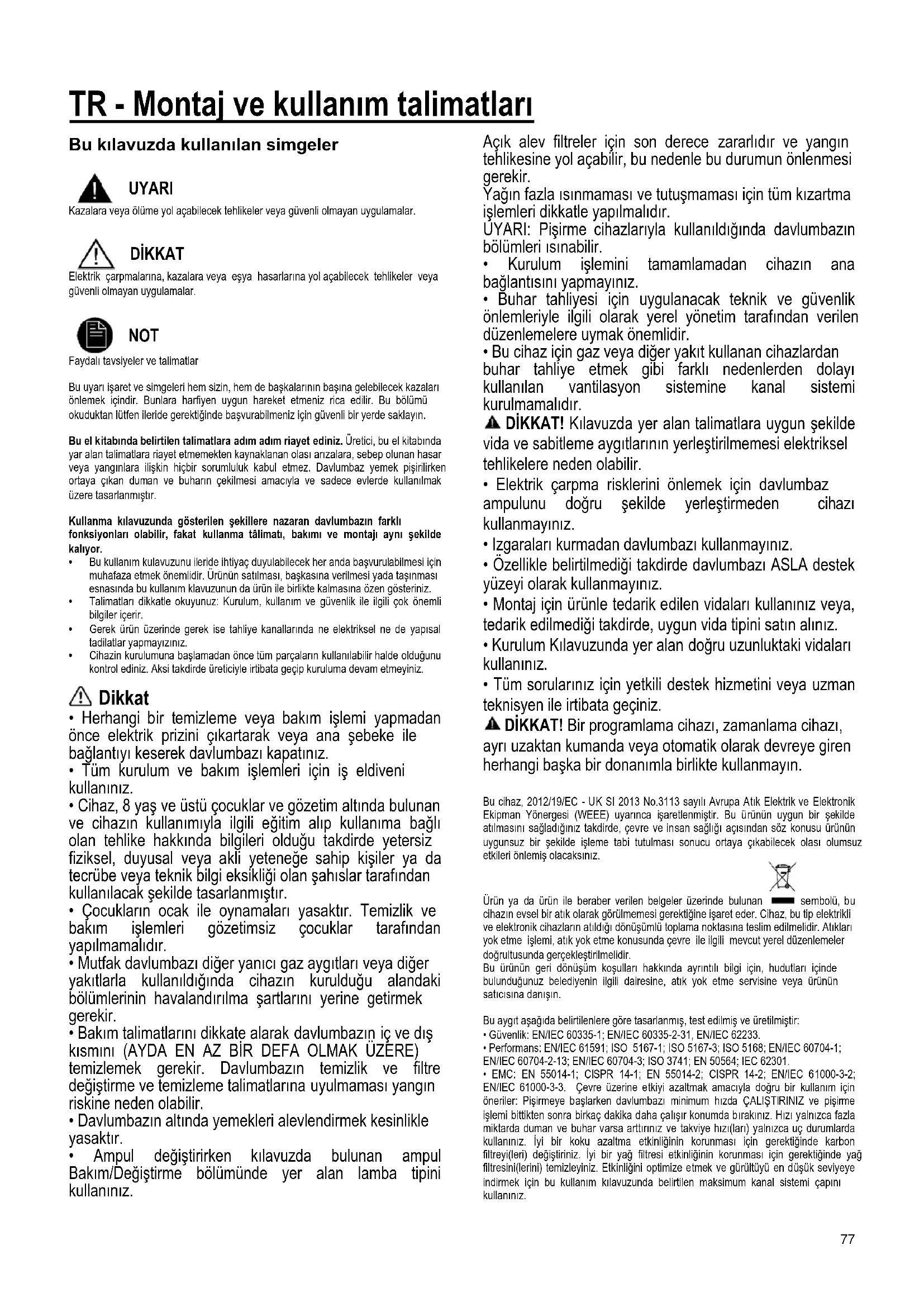 - EMC: EN 55014-1; CISPR 14-1; EN 55014-2; CISPR 14-2; EN/IEC 61000-3-2; EN/IEC 61000-3-3. Çevre üzerine etkiyi azaltmak amacıyla doğru bir kullanım için öneriler: Pişirmeye başlarken davlumbazı minimum hızda ÇALIŞTIRINIZ ve pişirme işlemi bittikten sonra birkaç dakika daha çalışır konumda bırakınız. Hızı yalnızca fazla miktarda duman ve buhar varsa arttırınız ve takviye hızı(ları) yalnızca uç durumlarda kullanınız. İyi bir koku azaltma etkinliğinin korunması için gerektiğinde karbon filtreyi(leri) değiştiriniz. İyi bir yağ filtresi etkinliğinin korunması için gerektiğinde yağ filtresini(lerini) temizleyiniz. Etkinliğini optimize etmek ve gürültüyü en düşük seviyeye indirmek için bu kullanım kılavuzunda belirtilen maksimum kanal sistemi çapını kullanınız.78