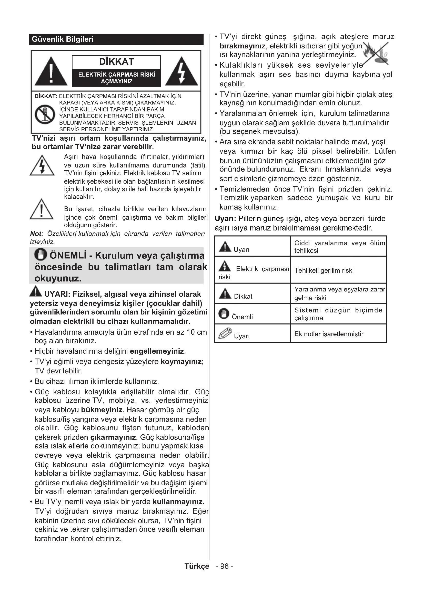 - Temizlemeden önce TV’nin şini prizden çekiniz. Temizlik yaparken sadece yumuşak ve kuru bir kumaş kullanınız. Uyarı: Pillerin güneş ışığı, ateş veya benzeri türde aşırı ısıya maruz bırakılmaması gerekmektedir. Uyarı Ciddi yaralanma veya ölüm tehlikesi Elektrik çarpması riski Tehlikeli gerilim riski Dikkat Yaralanma veya eşyalara zarar gelme riski Önemli Sistemi düzgün biçimde çalıştırma Uyarı Ek notlar işaretlenmiştirTürkçe - 97 - Ürün üzerindeki İşaretler Aşağıdaki semboller ürün üzerinde sınırlamalar ve önlemler ile güvenlik talimatları için işaretçi olarak kullanılmaktadır. Buradaki açıklamaların her biri, sadece ürünün ilgili işareti taşıması durumunda değerlendirilmelidir. Not Bu bilgilere güvenlik açısından dikkat ediniz. Sınıf II Ekipman: Bu cihaz, güvenli bir elektriksel topraklama bağlantısı gerektirmeyecek şekilde tasarlanmıştır. İşlevsel Topraklama ile Sınıf II Ekipman: Bu cihaz, güvenli bir elektriksel topraklama bağlantısı gerektirecek şekilde tasarlanmıştır, topraklama bağlantısı işlevsel amaçlar içindir. Koruyucu Topraklama Bağlantısı: Bu işaret besleme kablosu ile ilişkili koruyucu topraklama iletkeninin bağlanması için amaçlanmıştır. Tehlikeli Canlı Klemens: İşaretlenmiş klemens(ler) normal çalışma koşulları altında elektrik içerdiği için tehlikelidir. Dikkat, Bakınız Kullanım Açıklamaları: İşaretlenmiş alan(lar) kullanıcı tarafından değiştirilebilecek pul veya düğme tipi pil(ler) içermektedir. Sınıf 1 Lazer Ürün: Bu ürün, öngörülen çalışma koşullarında makul ölçüde güvenli olan Sınıf 1 lazer kaynağı içermektedir. UYARI Pili yutmayınız, Kimyasal Yanma tehlikesi (Birlikte verilen aksesuarlar veya) Bu ürün bir pul/düğme tipi pil içerebilir. Eğer düğme tipi pil yutulursa, sadece 2 saat içerisinde vücudunuzun içinde ciddi yanmalara ve ölüme neden olabilir. Yeni ve kullanılmış pilleri çocuklardan uzak tutunuz. Eğer pil yuvası düzgün bir şekilde kapanmı- yorsa, ürünü kullanmayınız ve çocuklardan uzak tutunuz. Eğer pillerin yutulduğunu veya vücudunuzda bulunduğunu düşünüyorsanız, derhal tıbbi destek alınız.