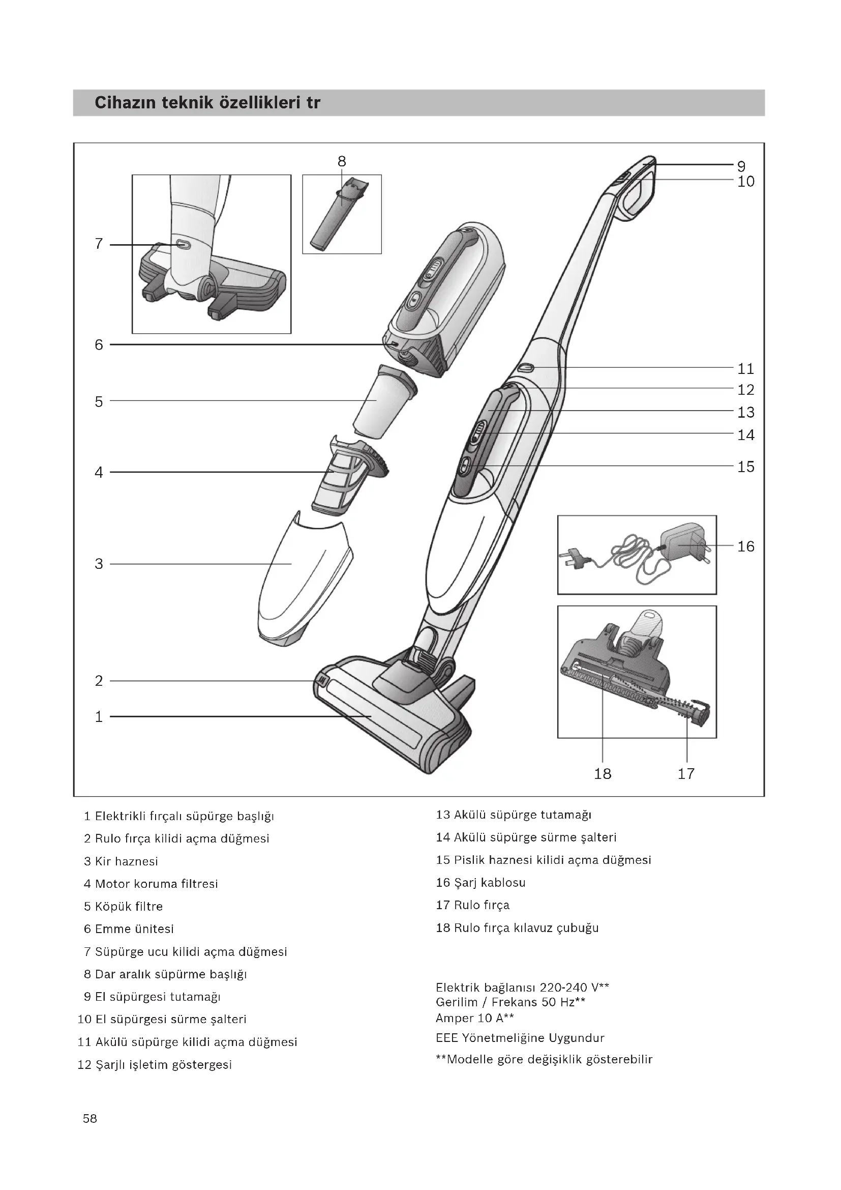 el58 Cihazın teknik özellikleri tr 1 Elektrikli fırçalı süpürge başlığı 2 Rulo fırça kilidi açma düğmesi 3 Kir haznesi 4 Motor koruma filtresi 5 Köpük filtre 6 Emme ünitesi 7 Süpürge ucu kilidi açma düğmesi 8 Dar aralık süpürme başlığı 9 El süpürgesi tutamağı 10 El süpürgesi sürme şalteri 11 Akülü süpürge kilidi açma düğmesi 12 Şarjlı işletim göstergesi 13 Akülü süpürge tutamağı 14 Akülü süpürge sürme şalteri 15 Pislik haznesi kilidi açma düğmesi 16 Şarj kablosu 17 Rulo fırça 18 Rulo fırça kılavuz çubuğu Elektrik bağlanısı 220-240 V** Gerilim / Frekans 50 Hz** Amper 10 A** EEE Yönetmeliğine Uygundur **Modelle göre değişiklik gösterebilir