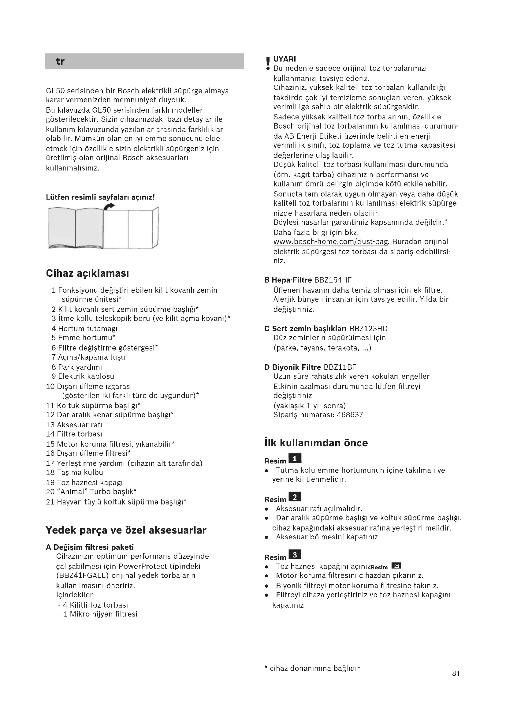 - cihaz donanımına bağlıdır GL50 serisinden bir Bosch elektrikli süpürge almaya karar vermenizden memnuniyet duyduk. Bu kılavuzda GL50 serisinden farklı modeller gösterilecektir. Sizin cihazınızdaki bazı detaylar ile kullanım kılavuzunda yazılanlar arasında farklılıklar olabilir. Mümkün olan en iyi emme sonucunu elde etmek için özellikle sizin elektrikli süpürgeniz için üretilmiş olan orijinal Bosch aksesuarları kullanmalısınız. Lütfen resimli sayfaları açınız! Cihaz açıklaması 1 Fonksiyonu değiştirilebilen kilit kovanlı zemin süpürme ünitesi* 2 Kilit kovanlı sert zemin süpürme başlığı* 3 İtme kollu teleskopik boru (ve kilit açma kovanı)* 4 Hortum tutamağı 5 Emme hortumu* 6 Filtre değiştirme göstergesi* 7 Açma/kapama tuşu 8 Park yardımı 9 Elektrik kablosu 10 Dışarı üfleme ızgarası (gösterilen iki farklı türe de uygundur)* 11 Koltuk süpürme başlığı* 12 Dar aralık kenar süpürme başlığı* 13 Aksesuar rafı 14 Filtre torbası 15 Motor koruma filtresi, yıkanabilir* 16 Dışarı üfleme filtresi* 17 Yerleştirme yardımı (cihazın alt tarafında) 18 Taşıma kulbu 19 Toz haznesi kapağı 20 “Animal” Turbo başlık* 21 Hayvan tüylü koltuk süpürme başlığı* Yedek parça ve özel aksesuarlar A Değişim filtresi paketi Cihazınızın optimum performans düzeyinde çalışabilmesi için PowerProtect tipindeki (BBZ41FGALL) orijinal yedek torbaların kullanılmasını öneririz. İçindekiler: - 4 Kilitli toz torbası - 1 Mikro-hijyen filtresi