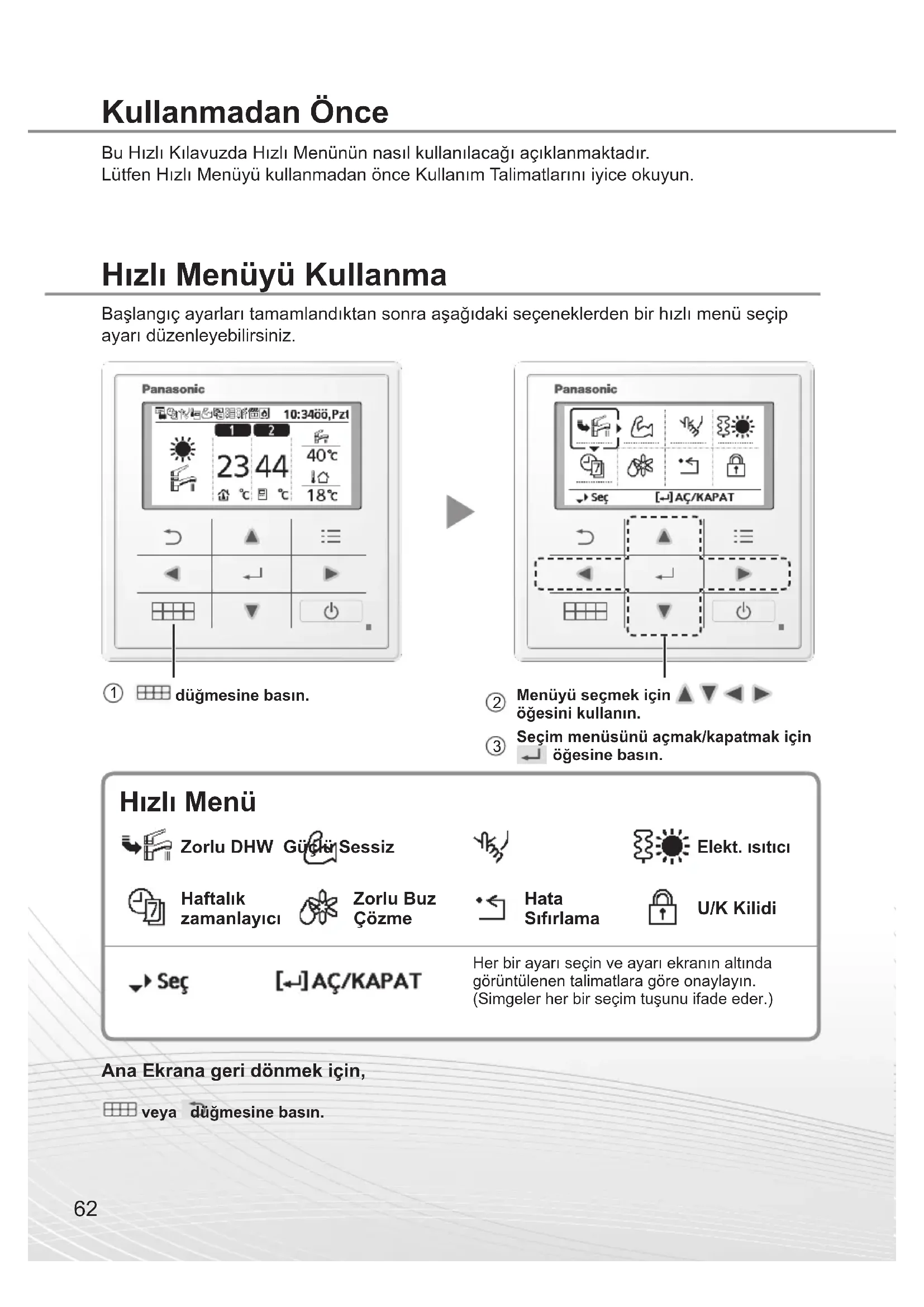 düğmesine basın. Menüyü seçmek için öğesini kullanın. Seçim menüsünü açmak/kapatmak için öğesine basın.63 Türkçe Hızlı Menüyü Kullanma Tank DHW'yi açmak veya kapatmak için bu simgeyi seçin. Seçiminizi onaylamak için düğmesine basın.