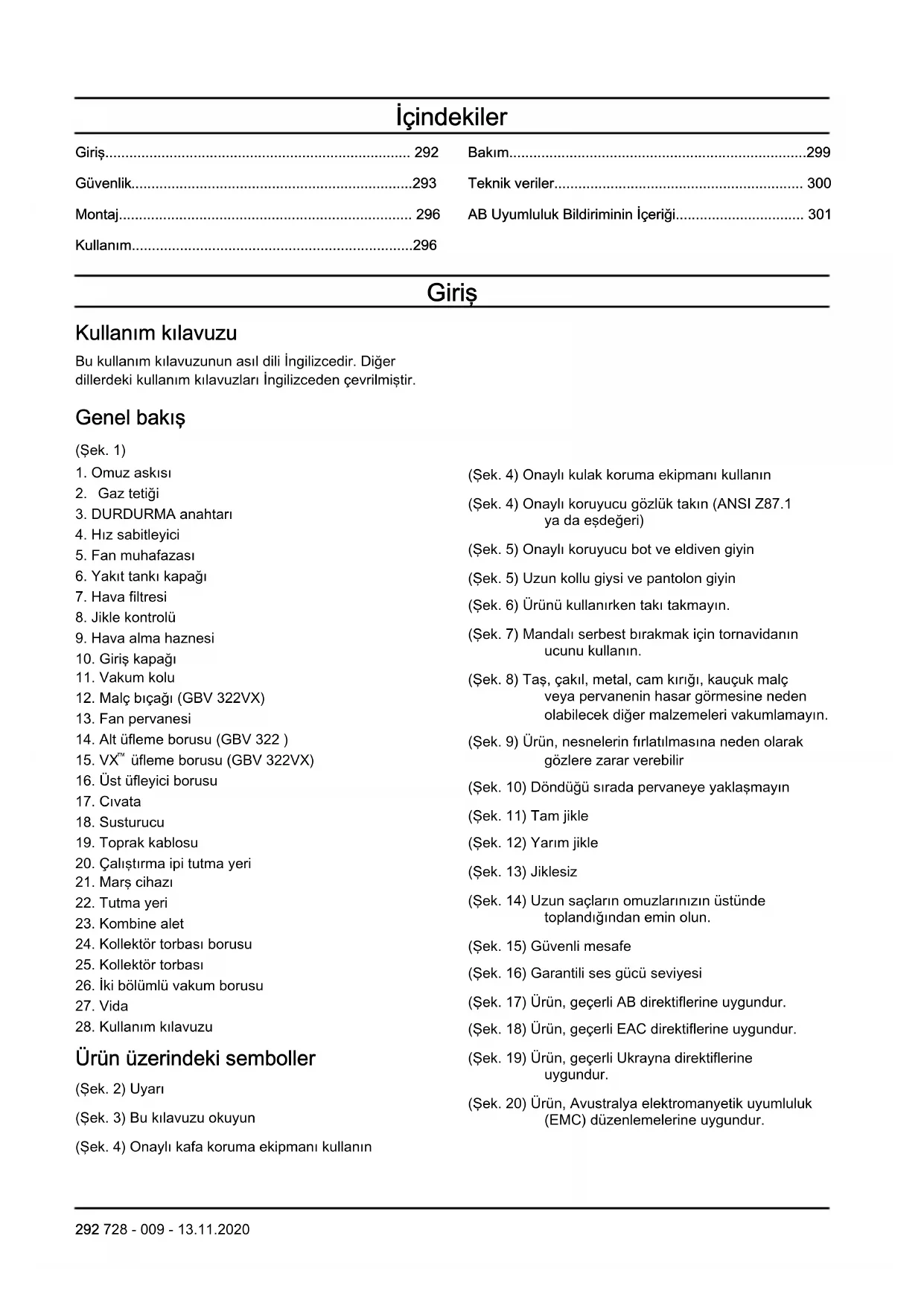 Ürün üzerindeki semboller (Şek. 2) Uyarı (Şek. 3) Bu kılavuzu okuyun (Şek. 4) Onaylı kafa koruma ekipmanı kullanın (Şek. 4) Onaylı kulak koruma ekipmanı kullanın (Şek. 4) Onaylı koruyucu gözlük takın (ANSI Z87.1 ya da eşdeğeri) (Şek. 5) Onaylı koruyucu bot ve eldiven giyin (Şek. 5) Uzun kollu giysi ve pantolon giyin (Şek. 6) Ürünü kullanırken takı takmayın. (Şek. 7) Mandalı serbest bırakmak için tornavidanın ucunu kullanın. (Şek. 8) Taş, çakıl, metal, cam kırığı, kauçuk malç veya pervanenin hasar görmesine neden olabilecek diğer malzemeleri vakumlamayın. (Şek. 9) Ürün, nesnelerin fırlatılmasına neden olarak gözlere zarar verebilir (Şek. 10) Döndüğü sırada pervaneye yaklaşmayın (Şek. 11) Tam jikle (Şek. 12) Yarım jikle (Şek. 13) Jiklesiz (Şek. 14) Uzun saçların omuzlarınızın üstünde toplandığından emin olun. (Şek. 15) Güvenli mesafe (Şek. 16) Garantili ses gücü seviyesi (Şek. 17) Ürün, geçerli AB direktiflerine uygundur. (Şek. 18) Ürün, geçerli EAC direktiflerine uygundur. (Şek. 19) Ürün, geçerli Ukrayna direktiflerine uygundur. (Şek. 20) Ürün, Avustralya elektromanyetik uyumluluk (EMC) düzenlemelerine uygundur. 292 728 - 009 - 13.11.2020Not: Ürünün üzerindeki diğer semboller/etiketler, diğer ticari alanların sertifikalandırma gereklilikleri ile ilgilidir. Avrupa V Emisyonları UYARI: Motorun kurcalanması bu ürünün AB tip onayını geçersiz kılar. Ürün sorumluluğu Ürün sorumluluğu yasalarında belirtildiği üzere;