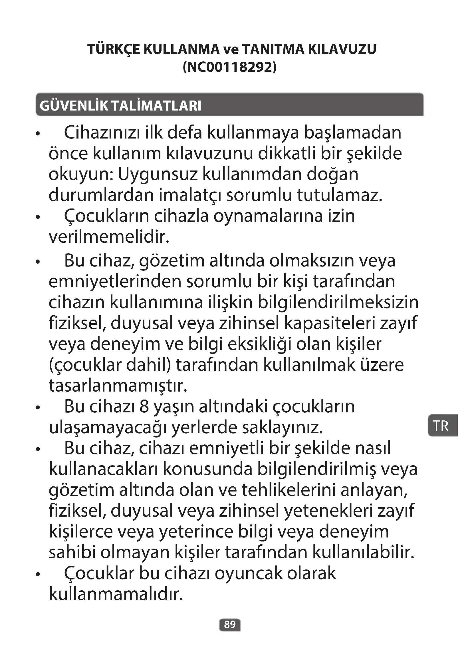 - Bu cihaz, gözetim altında olmaksızın veya emniyetlerinden sorumlu bir kişi tarafından cihazın kullanımına ilişkin bilgilendirilmeksizin fiziksel, duyusal veya zihinsel kapasiteleri zayıf veya deneyim ve bilgi eksikliği olan kişiler (çocuklar dahil) tarafından kullanılmak üzere tasarlanmamıştır.
