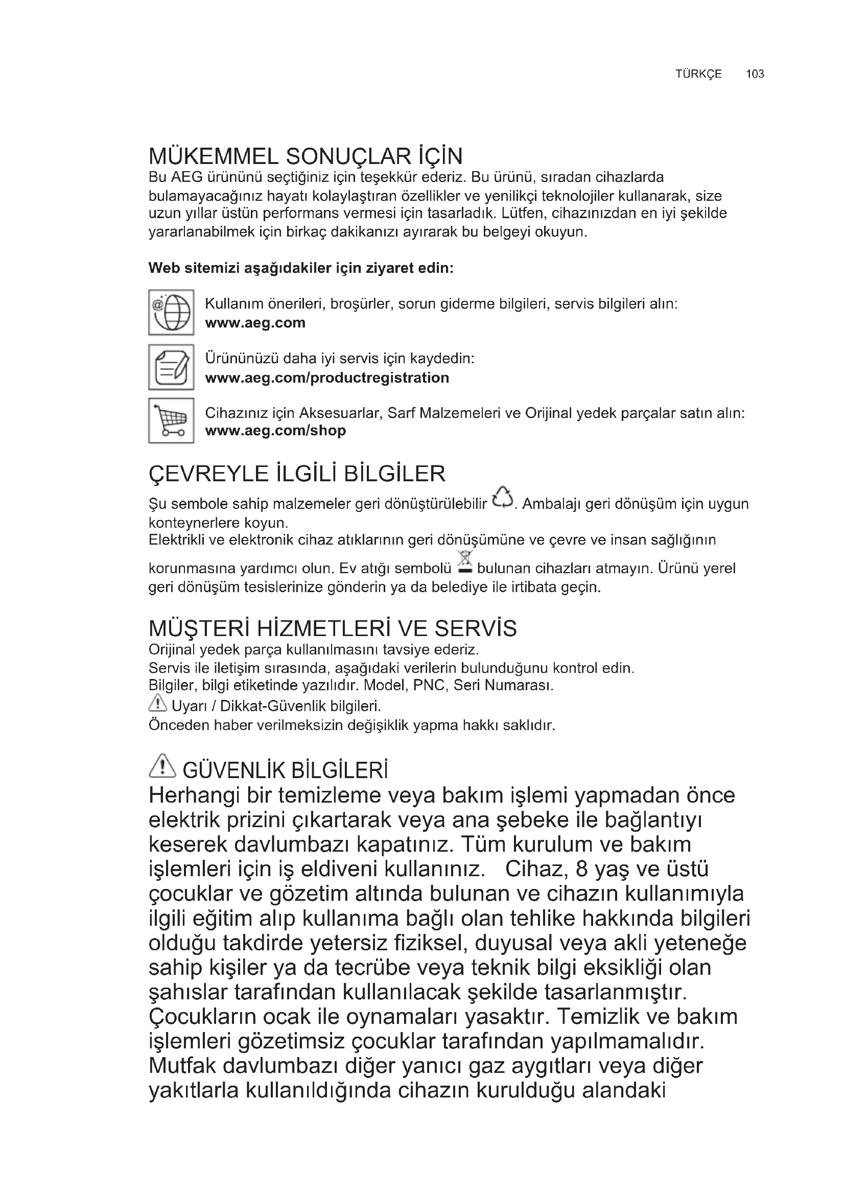 Herhangi bir temizleme veya bakım işlemi yapmadan önce elektrik prizini çıkartarak veya ana şebeke ile bağlantıyı keserek davlumbazı kapatınız. Tüm kurulum ve bakım işlemleri için iş eldiveni kullanınız. Cihaz, 8 yaş ve üstü çocuklar ve gözetim altında bulunan ve cihazın kullanımıyla ilgili eğitim alıp kullanıma bağlı olan tehlike hakkında bilgileri olduğu takdirde yetersiz fi ziksel, duyusal veya akli yeteneğe sahip kişiler ya da tecrübe veya teknik bilgi eksikliği olan şahıslar tarafından kullanılacak şekilde tasarlanmıştır. Çocukların ocak ile oynamaları yasaktır. Temizlik ve bakım işlemleri gözetimsiz çocuklar tarafından yapılmamal ıdır. Mutfak davlumbazı diğer yanıcı gaz aygıtları veya diğer yakıtlarla kullanıldığında cihazın kurulduğu alandaki TR KULLANIM KITAPÇIĞIwww.aeg.com