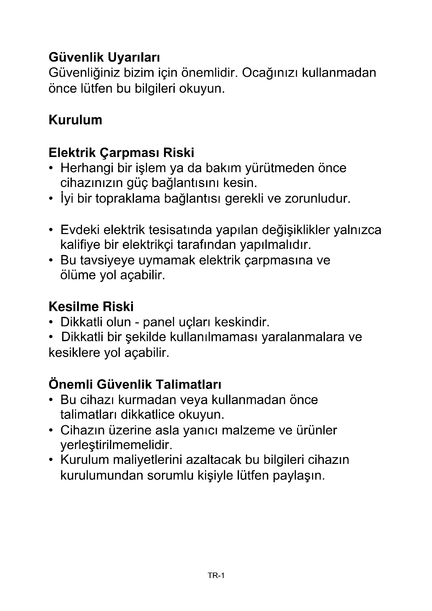 FR-30 1 1 UGüvenlik Uyarıları Güvenliğiniz bizim için önemlidir. Ocağınızı kullanmadan önce lütfen bu bilgileri okuyun. Kurulum Elektrik Çarpması Riski