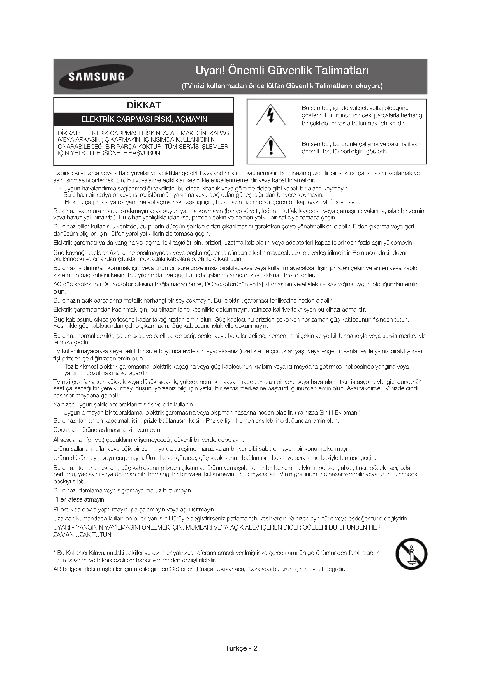 ONARABİLECEĞİ BİR PARÇA YOKTUR. TÜM SERVİS İŞLEMLERİ İÇİN YETKİLİ PERSONELE BAŞVURUN. Bu sembol, içinde yüksek voltaj olduğunu gösterir. Bu ürünün içindeki parçalarla herhangi bir şekilde temasta bulunmak tehlikelidir. Bu sembol, bu ürünle çalışma ve bakıma ilişkin önemli literatür verildiğini gösterir. Kabindeki ve arka veya alttaki yuvalar ve açıklıklar gerekli havalandırma için sağlanmıştır. Bu cihazın güvenilir bir şekilde çalışmasını sağlamak ve aşırı ısınmasını önlemek için, bu yuvalar ve açıklıklar kesinlikle engellenmemelidir veya kapatılmamalıdır. - Uygun havalandırma sağlanmadığı takdirde, bu cihazı kitaplık veya gömme dolap gibi kapalı bir alana koymayın. - Bu cihazı bir radyatör veya ısı rezistörünün yakınına veya doğrudan güneş ışığı alan bir yere koymayın. - Elektrik çarpması ya da yangına yol açma riski taşıdığı için, bu cihazın üzerine su içeren bir kap (vazo vb.) koymayın. Bu cihazı yağmura maruz bırakmayın veya suyun yanına koymayın (banyo küveti, leğen, mutfak lavabosu veya çamaşırlık yakınına, ıslak bir zemine veya havuz yakınına vb.). Bu cihaz yanlışlıkla ıslanırsa, prizden çekin ve hemen yetkili bir satıcıyla temasa geçin. Bu cihaz piller kullanır. Ülkenizde, bu pillerin düzgün şekilde elden çıkarılmasını gerektiren çevre yönetmelikleri olabilir. Elden çıkarma veya geri dönüşüm bilgileri için, lütfen yerel yetkililerinizle temasa geçin. Elektrik çarpması ya da yangına yol açma riski taşıdığı için, prizleri, uzatma kablolarını veya adaptörleri kapasitelerinden fazla aşırı yüklemeyin. Güç kaynağı kabloları üzerlerine basılmayacak veya başka öğeler tarafından sıkıştırılmayacak şekilde yerleştirilmelidir. Fişin ucundaki, duvar prizlerindeki ve cihazdan çıktıkları noktadaki kablolara özellikle dikkat edin. Bu cihazı yıldırımdan korumak için veya uzun bir süre gözetimsiz bırakılacaksa veya kullanılmayacaksa, fişini prizden çekin ve anten veya kablo sisteminin bağlantısını kesin. Bu, yıldırımdan ve güç hattı dalgalanmalarından kaynaklanan hasarı önler. AC güç kablosunu DC adaptör çıkışına bağlamadan önce, DC adaptörünün voltaj atamasının yerel elektrik kaynağına uygun olduğundan emin olun. Bu cihazın açık parçalarına metalik herhangi bir şey sokmayın. Bu, elektrik çarpması tehlikesine neden olabilir. Elektrik çarpmasından kaçınmak için, bu cihazın içine kesinlikle dokunmayın. Yalnızca kalifiye teknisyen bu cihazı açmalıdır. Güç kablosunu sıkıca yerleşene kadar taktığınızdan emin olun. Güç kablosunu prizden çekerken her zaman güç kablosunun fişinden tutun. Kesinlikle güç kablosundan çekip çıkarmayın. Güç kablosuna ıslak elle dokunmayın. Bu cihaz normal şekilde çalışmazsa ve özellikle de garip sesler veya kokular gelirse, hemen fişini çekin ve yetkili bir satıcıyla veya servis merkeziyle temasa geçin. TV kullanılmayacaksa veya belirli bir süre boyunca evde olmayacaksanız (özellikle de çocuklar, yaşlı veya engelli insanlar evde yalnız bırakılıyorsa) fişi prizden çektiğinizden emin olun. - Toz birikmesi elektrik çarpmasına, elektrik kaçağına veya güç kablosunun kıvılcım veya ısı meydana getirmesi neticesinde yangına veya yalıtımın bozulmasına yol açabilir. TV'nizi çok fazla toz, yüksek veya düşük sıcaklık, yüksek nem, kimyasal maddeler olan bir yere veya hava alanı, tren istasyonu vb. gibi günde 24 saat çalışacağı bir yere kurmayı düşünüyorsanız bilgi için yetkili bir servis merkezine başvurduğunuzdan emin olun. Aksi takdirde TV'nizde ciddi hasarlar meydana gelebilir. Yalnızca uygun şekilde topraklanmış fiş ve priz kullanın. - Uygun olmayan bir topraklama, elektrik çarpmasına veya ekipman hasarına neden olabilir. (Yalnızca Sınıf l Ekipman.) Bu cihazı tamamen kapatmak için, prizle bağlantısını kesin. Priz ve fişin hemen erişilebilir olduğundan emin olun. Çocukların ürüne asılmasına izin vermeyin. Aksesuarları (pil vb.) çocukların erişemeyeceği, güvenli bir yerde depolayın. Ürünü sallanan raflar veya eğik bir zemin ya da titreşime maruz kalan bir yer gibi sabit olmayan bir konuma kurmayın. Ürünü düşürmeyin veya çarpmayın. Ürün hasar görürse, güç kablosunun bağlantısını kesin ve servis merkeziyle temasa geçin. Bu cihazı temizlemek için, güç kablosunu prizden çıkarın ve ürünü yumuşak, temiz bir bezle silin. Mum, benzen, alkol, tiner, böcek ilacı, oda parfümü, yağlayıcı veya deterjan gibi herhangi bir kimyasal kullanmayın. Bu kimyasallar TV'nin görünümüne hasar verebilir veya ürün üzerindeki baskıyı silebilir. Bu cihazı damlama veya sıçramaya maruz bırakmayın. Pilleri ateşe atmayın. Pillere kısa devre yaptırmayın, parçalamayın veya aşırı ısıtmayın. Uzaktan kumandada kullanılan pilleri yanlış pil türüyle değiştirirseniz patlama tehlikesi vardır. Yalnızca aynı türle veya eşdeğer türle değiştirin. UYARI - YANGININ YAYILMASINI ÖNLEMEK İÇİN, MUMLARI VEYA AÇIK ALEV İÇEREN DİĞER ÖĞELERİ BU ÜRÜNDEN HER ZAMAN UZAK TUTUN.