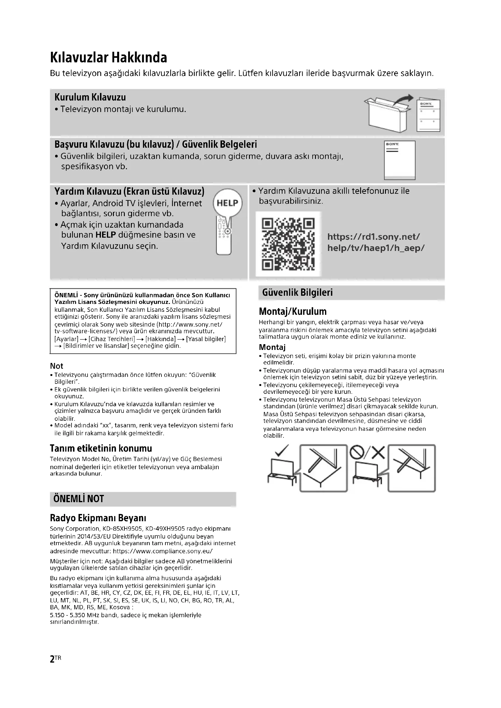 - Kurulum Kılavuzu’nda ve kılavuzda kullan ılan resimler ve çizimler yalnızca başvuru amaçlıdır ve gerçek üründen farklı olabilir.• Model adındaki “xx”, tasarım, renk veya televizyon sistemi farkı ile ilgili bir rakama karşılık gelmektedir. Tanım etiketinin konumu Televizyon Model No, Üretim Tarihi (yıl/ay) ve Güç Beslemesi nominal değerleri için etiketler televizyonun veya ambalajın arkasında bulunur. ÖNEMLİ NOT Radyo Ekipmanı Beyanı Sony Corporation, KD-85XH9505, KD-49XH9505 radyo ekipmanı türlerinin 2014/53/EU Direktifiyle uyumlu olduğunu beyan etmektedir. AB uygunluk beyanının tam metni, aşağıdaki internet adresinde mevcuttur: https://www.compliance.sony.eu/Müşteriler için not: Aşağıdaki bilgiler sadece AB yönetmeliklerini uygulayan ülkelerde satılan cihazlar için geçerlidir.Bu radyo ekipmanı için kullanıma alma hususunda aşağıdaki kısıtlamalar veya kullanım yetkisi gereksinimleri şunlar için geçerlidir: AT, BE, HR, CY, CZ, DK, EE, FI, FR, DE, EL, HU, IE, IT, LV, LT, LU, MT, NL, PL, PT, SK, SI, ES, SE, UK, IS, LI, NO, CH, BG, RO, TR, AL, BA, MK, MD, RS, ME, Kosova :5.150 - 5.350 MHz bandı, sadece iç mekan işlemleriyle sınırlandırılmıştır. Güvenlik Bilgileri Montaj/Kurulum Herhangi bir yangın, elektrik çarpması veya hasar ve/veya yaralanma riskini önlemek amacıyla televizyon setini aşağıdaki talimatlara uygun olarak monte ediniz ve kullanınız. Montaj