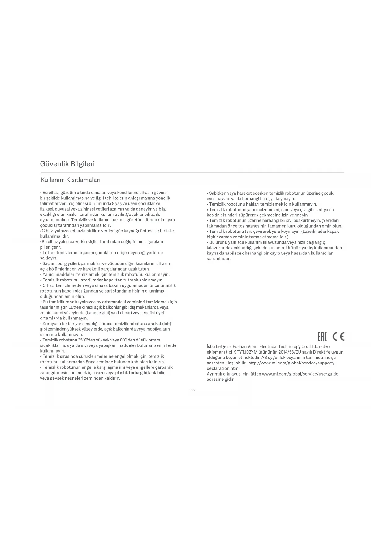 İşbu belge ile Foshan Viomi Electrical Technology Co., Ltd., radyo ekipmanı tipi STYTJ02YM ürününün 2014/53/EU sayılı Direktife uygun olduğunu beyan etmektedir. AB uygunluk beyanının tam metnine şu adresten ulaşılabilir: hp://www.mi.com/global/service/support/ Ayrıntılı e-kılavuz için lütfen www.mi.com/global/service/userguide adresine gidin declaration.html• UYARI: Pili şarj etmek için, yalnızca bu cihazla birlikte verilen sökülebilir besleme ünitesini kullanın.