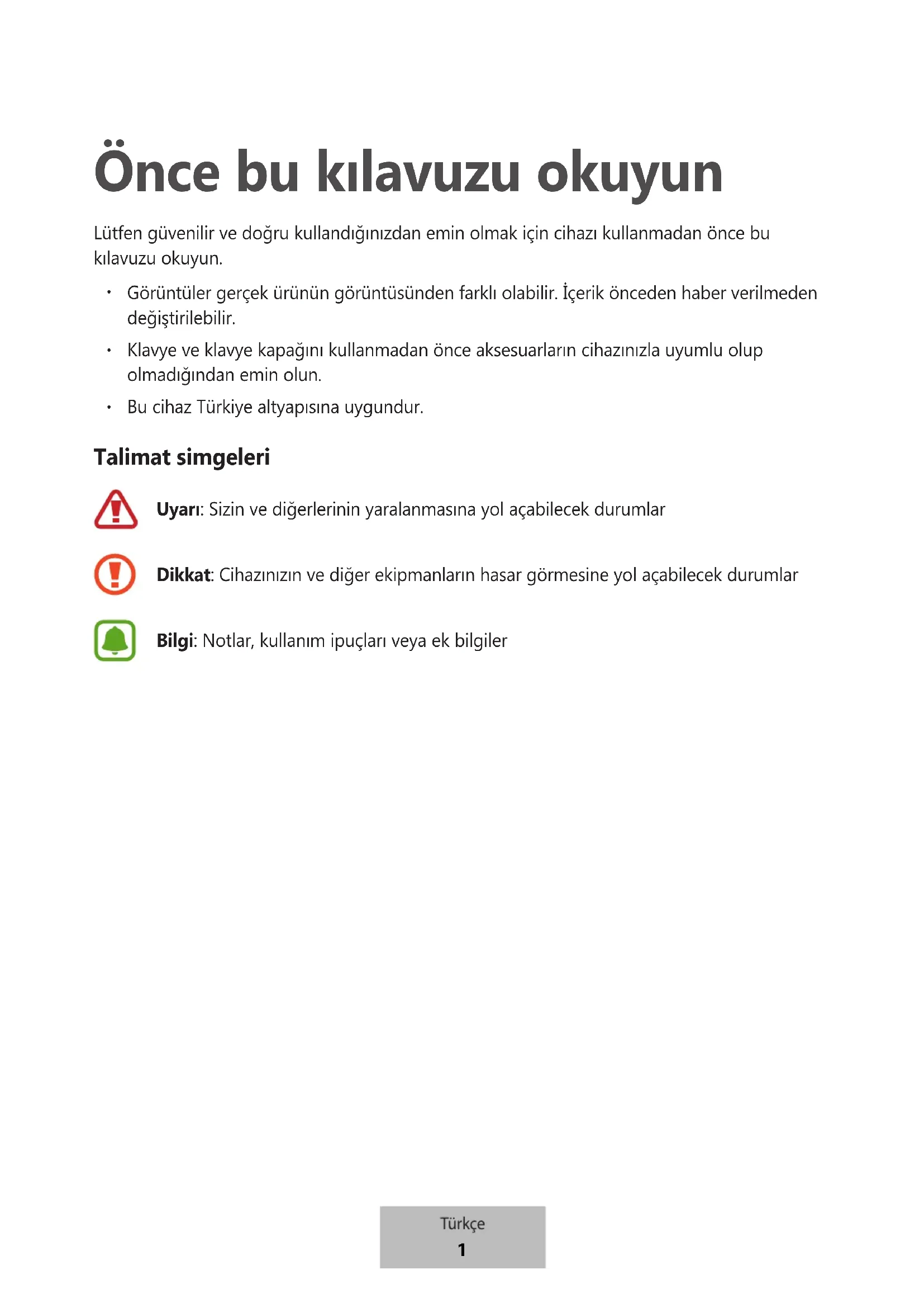 Bu cihaz Türkiye altyapısına uygundur. Talimat simgeleri Uyarı: Sizin ve diğerlerinin yaralanmasına yol açabilecek durumlar Dikkat: Cihazınızın ve diğer ekipmanların hasar görmesine yol açabilecek durumlar Bilgi: Notlar, kullanım ipuçları veya ek bilgiler Türkçe