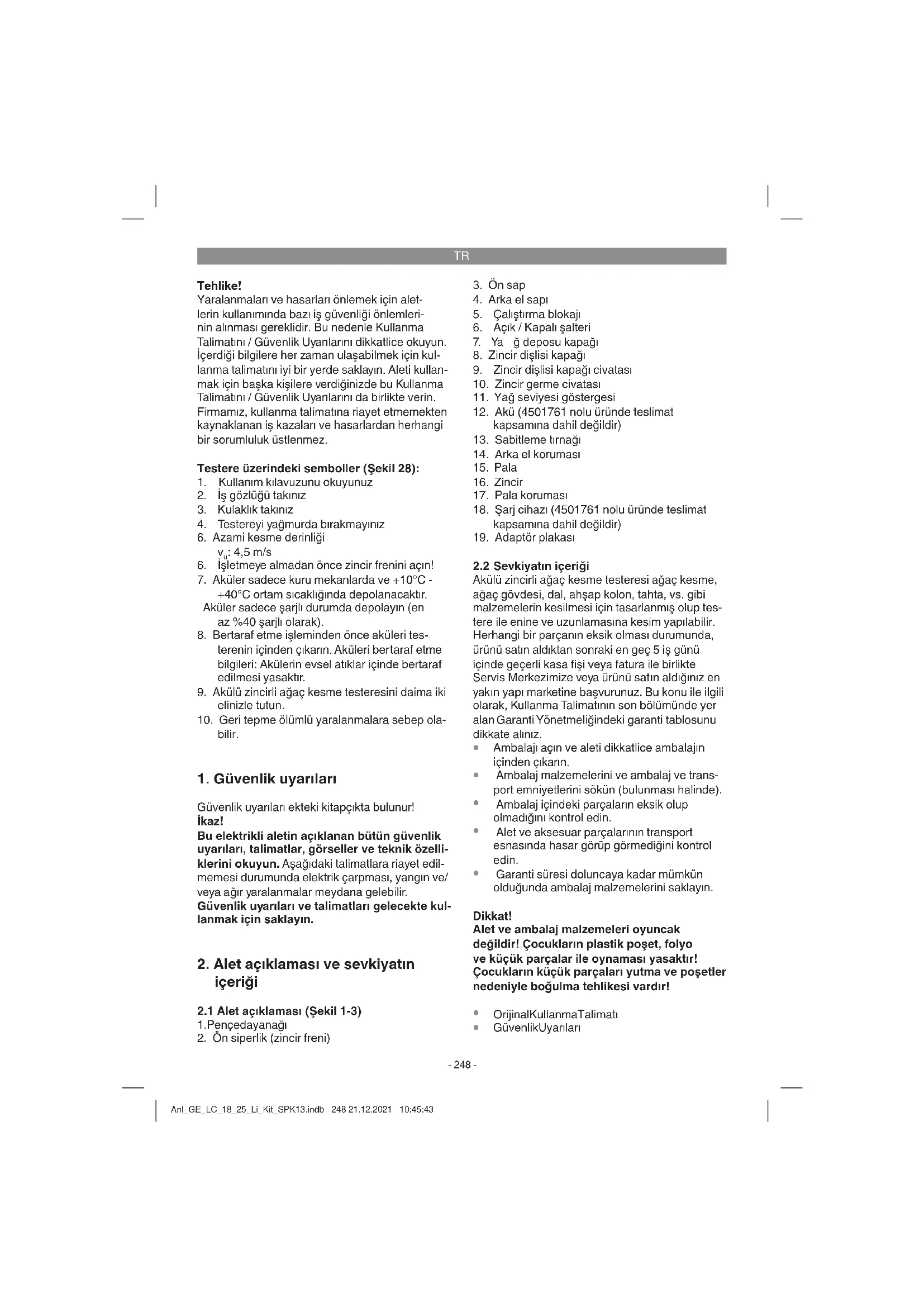 Motor freni Açık / Kapalı şalteri (Şekil1 / Poz.6) bırakılır bırakılmaz veya testerenin cereyan bağlantısı kesildiğinde motor, zinciri frenler. Böylece zincirin dönmeye devam etmesi önlenerek yaralanma riski ortadan kaldırılır. Zincir freni Zincir freni bir koruma mekanizması olup ön el koruması üzerinden devreye alınır (Şekil 1 / Poz.2). Zincirli testere geri tepme nedeniyle geri- ye fırlatıldığında zincir freni devreye girer ve zinciri 0,1 saniyeden az bir sürede durdurur. Zincir freni fonksiyonunu düzenli aralıklar ile kon- trol edin. Kontrol için el korumasını öne katlayın (Şekil 1 / Poz.2) ve zincirli testereyi kısaca çalıştırın. Testere çalışmayacaktır. Zincir frenini açmak için ön el korumasını (Şekil 1 / Poz.2) yerine geçinceye kadar geriye çekin. Anl_GE_LC_18_25_Li_Kit_SPK13.indb 251 21.12.2021 10:45:44TR