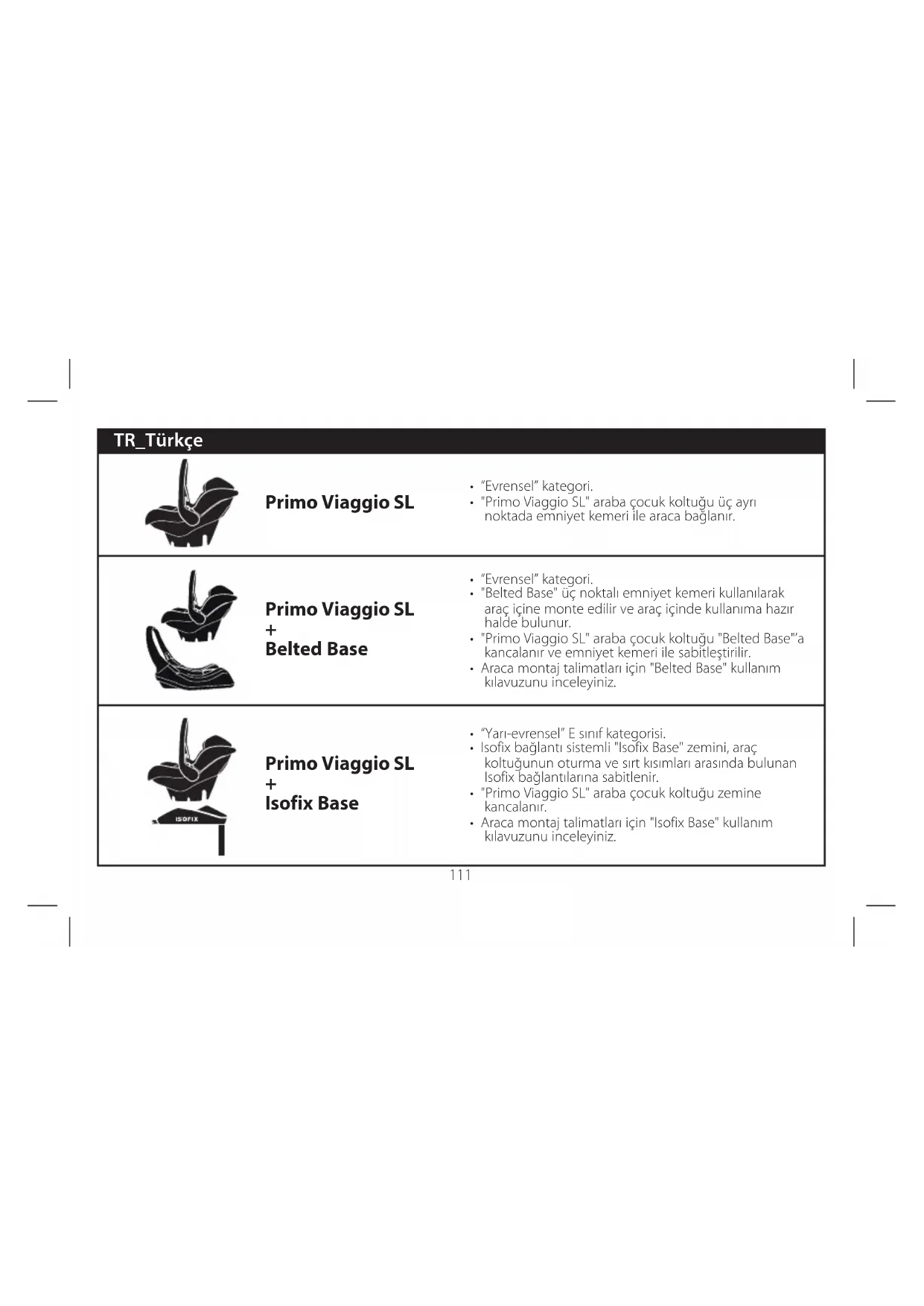 - Araca montaj talimatları için "Isofix Base" kullanım kılavuzunu inceleyiniz. Primo Viaggio SL Primo Viaggio SL