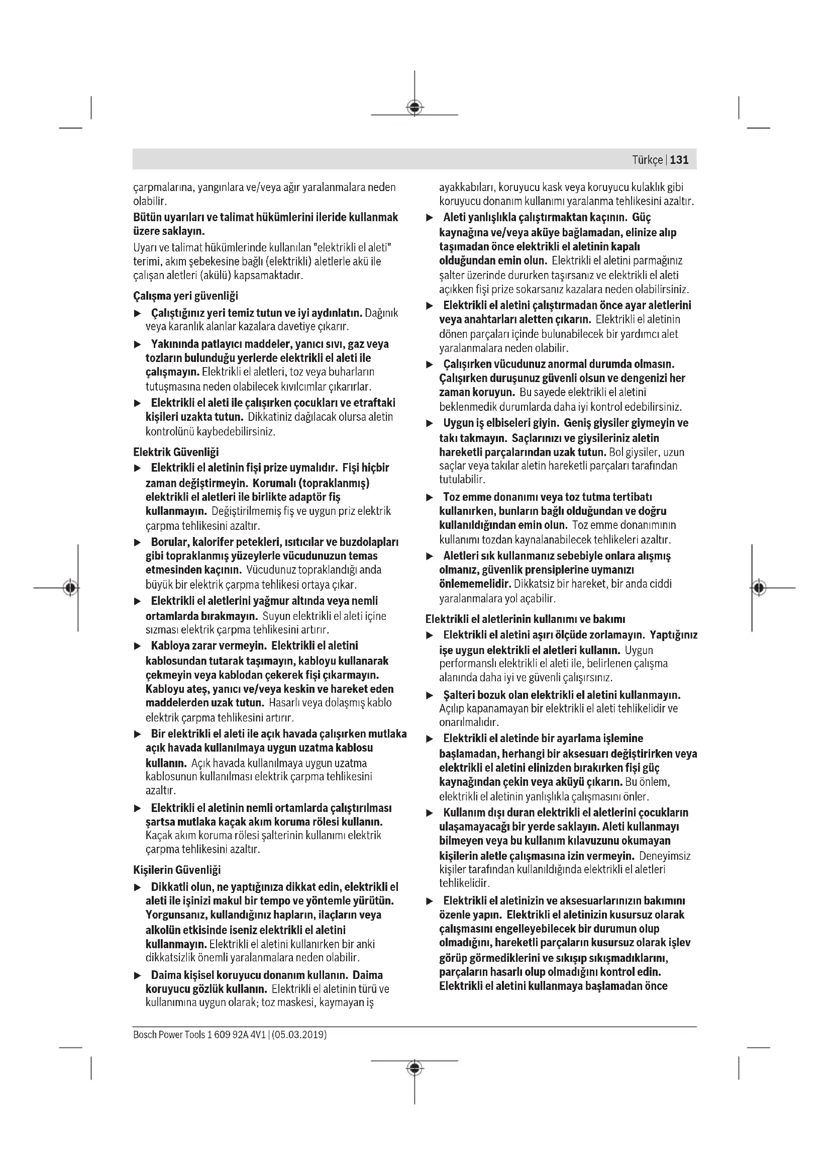 Τα ηλεκτρικά εργαλεία, οι μπαταρίες, τα εξαρτήματα και οι συσκευασίες πρέπει να ανακυκλώνονται με τρόπο φιλικό προς το περιβάλλον. Μην ρίχνετε τα ηλεκτρικά εργαλεία και τις μπαταρίες στα απορρίμματα του σπιτιού σας! Μόνο για χώρες τηςΕΕ: Σύμφωνα με την Ευρωπαϊκή οδηγία 2012/19/ΕΕ τα άχρηστα ηλεκτρικά εργαλεία και σύμφωνα με την Ευρωπαϊκή οδηγία 2006/66/ΕΚ οι χαλασμένες ή χρησιμοποιημένες μπαταρίες πρέπει να συλλέγονται ξεχωριστά για να ανακυκλωθούν με τρόπο φιλικό προς το περιβάλλον. Μπαταρίες/Επαναφορτιζόμενες μπαταρίες: Ni-Cd: Νικελίου-καδμίου Προσοχή: Αυτές οι μπαταρίες περιέχουν κάδμιο, ένα ιδιαίτερα τοξικό βαρύ μέταλλο. Ni-MH: Υδρίδιο νικελίου-μετάλλου Türkçe Güvenlik talimatı Elektrikli el aletleri için genel güvenlik uyarıları UYARI Bu elektrikli el aletiyle birlikte gelen tüm güvenlik uyarılarını, talimatları, resim ve açıklamaları okuyun. Aşağıda bulunan talimatlara uyulmaması halinde elektrik 1 609 92A 4V1 | (05.03.2019) Bosch Power ToolsTürkçe | 131 çarpmalarına, yangınlara ve/veya ağır yaralanmalara neden olabilir. Bütün uyarıları ve talimat hükümlerini ileride kullanmak üzere saklayın. Uyarı ve talimat hükümlerinde kullanılan "elektrikli el aleti" terimi, akım şebekesine bağlı (elektrikli) aletlerle akü ile çalışan aletleri (akülü) kapsamaktadır. Çalışma yeri güvenliği u Çalıştığınız yeri temiz tutun ve iyi aydınlatın. Dağınık veya karanlık alanlar kazalara davetiye çıkarır. u Yakınında patlayıcı maddeler, yanıcı sıvı, gaz veya tozların bulunduğu yerlerde elektrikli el aleti ile çalışmayın. Elektrikli el aletleri, toz veya buharların tutuşmasına neden olabilecek kıvılcımlar çıkarırlar. u Elektrikli el aleti ile çalışırken çocukları ve etraftaki kişileri uzakta tutun. Dikkatiniz dağılacak olursa aletin kontrolünü kaybedebilirsiniz. Elektrik Güvenliği u Elektrikli el aletinin fişi prize uymalıdır. Fişi hiçbir zaman değiştirmeyin. Korumalı (topraklanmış) elektrikli el aletleri ile birlikte adaptör fiş kullanmayın. Değiştirilmemiş fiş ve uygun priz elektrik çarpma tehlikesini azaltır. u Borular, kalorifer petekleri, ısıtıcılar ve buzdolapları gibi topraklanmış yüzeylerle vücudunuzun temas etmesinden kaçının. Vücudunuz topraklandığı anda büyük bir elektrik çarpma tehlikesi ortaya çıkar. u Elektrikli el aletlerini yağmur altında veya nemli ortamlarda bırakmayın. Suyun elektrikli el aleti içine sızması elektrik çarpma tehlikesini artırır. u Kabloya zarar vermeyin. Elektrikli el aletini kablosundan tutarak taşımayın, kabloyu kullanarak çekmeyin veya kablodan çekerek fişi çıkarmayın. Kabloyu ateş, yanıcı ve/veya keskin ve hareket eden maddelerden uzak tutun. Hasarlı veya dolaşmış kablo elektrik çarpma tehlikesini artırır. u Bir elektrikli el aleti ile açık havada çalışırken mutlaka açık havada kullanılmaya uygun uzatma kablosu kullanın. Açık havada kullanılmaya uygun uzatma kablosunun kullanılması elektrik çarpma tehlikesini azaltır. u Elektrikli el aletinin nemli ortamlarda çalıştırılması şartsa mutlaka kaçak akım koruma rölesi kullanın. Kaçak akım koruma rölesi şalterinin kullanımı elektrik çarpma tehlikesini azaltır. Kişilerin Güvenliği u Dikkatli olun, ne yaptığınıza dikkat edin, elektrikli el aleti ile işinizi makul bir tempo ve yöntemle yürütün. Yorgunsanız, kullandığınız hapların, ilaçların veya alkolün etkisinde iseniz elektrikli el aletini kullanmayın. Elektrikli el aletini kullanırken bir anki dikkatsizlik önemli yaralanmalara neden olabilir. u Daima kişisel koruyucu donanım kullanın. Daima koruyucu gözlük kullanın. Elektrikli el aletinin türü ve kullanımına uygun olarak; toz maskesi, kaymayan iş ayakkabıları, koruyucu kask veya koruyucu kulaklık gibi koruyucu donanım kullanımı yaralanma tehlikesini azaltır. u Aleti yanlışlıkla çalıştırmaktan kaçının. Güç kaynağına ve/veya aküye bağlamadan, elinize alıp taşımadan önce elektrikli el aletinin kapalı olduğundan emin olun. Elektrikli el aletini parmağınız şalter üzerinde dururken taşırsanız ve elektrikli el aleti açıkken fişi prize sokarsanız kazalara neden olabilirsiniz. u Elektrikli el aletini çalıştırmadan önce ayar aletlerini veya anahtarları aletten çıkarın. Elektrikli el aletinin dönen parçaları içinde bulunabilecek bir yardımcı alet yaralanmalara neden olabilir. u Çalışırken vücudunuz anormal durumda olmasın. Çalışırken duruşunuz güvenli olsun ve dengenizi her zaman koruyun. Bu sayede elektrikli el aletini beklenmedik durumlarda daha iyi kontrol edebilirsiniz. u Uygun iş elbiseleri giyin. Geniş giysiler giymeyin ve takı takmayın. Saçlarınızı ve giysileriniz aletin hareketli parçalarından uzak tutun. Bol giysiler, uzun saçlar veya takılar aletin hareketli parçaları tarafından tutulabilir. u Toz emme donanımı veya toz tutma tertibatı kullanırken, bunların bağlı olduğundan ve doğru kullanıldığından emin olun. Toz emme donanımının kullanımı tozdan kaynalanabilecek tehlikeleri azaltır. u Aletleri sık kullanmanız sebebiyle onlara alışmış olmanız, güvenlik prensiplerine uymanızı önlememelidir. Dikkatsiz bir hareket, bir anda ciddi yaralanmalara yol açabilir. Elektrikli el aletlerinin kullanımı ve bakımı u Elektrikli el aletini aşırı ölçü