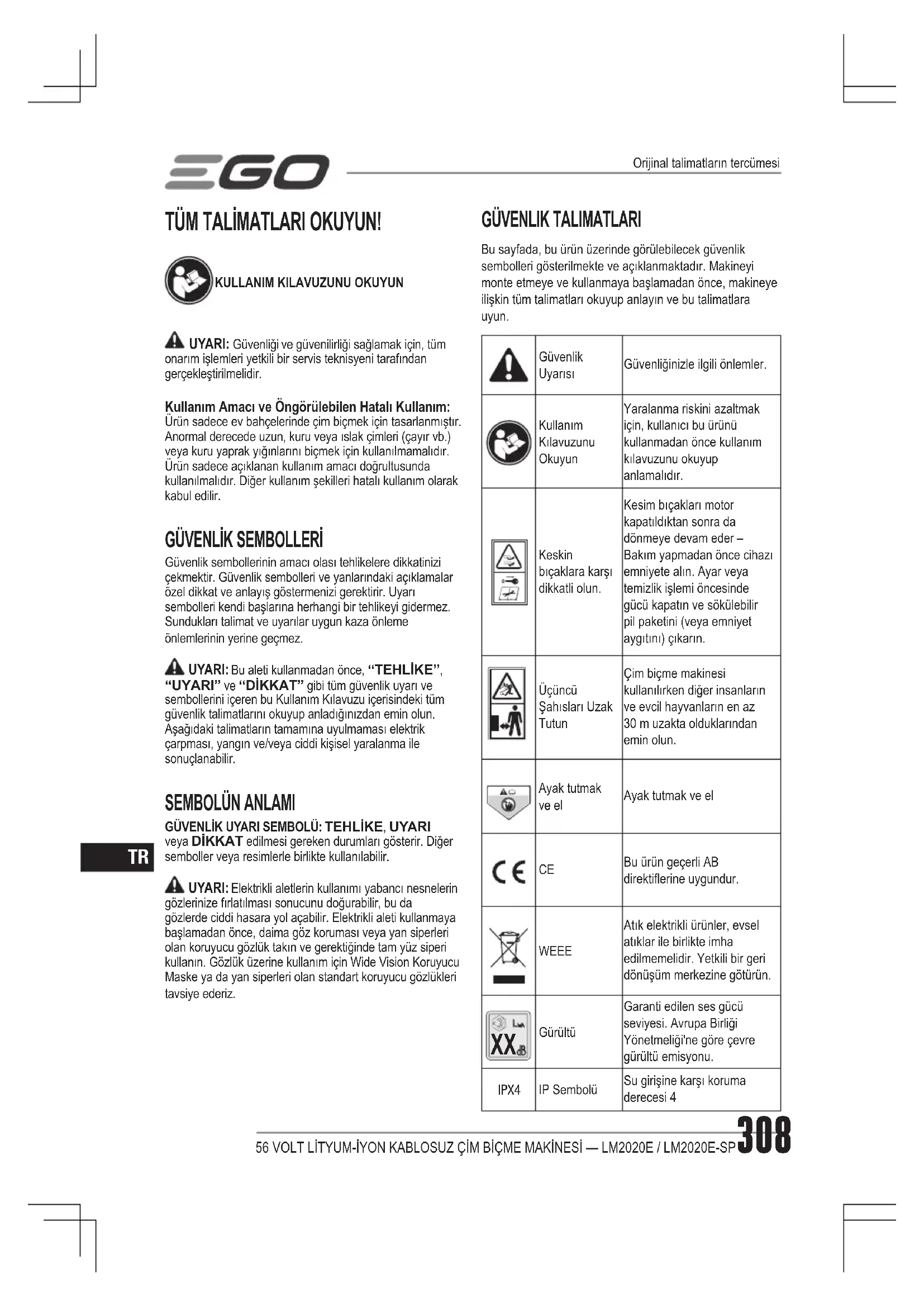 GürültüGaranti edilen ses gücü seviyesi. Avrupa Birliği Yönetmeliği'ne göre çevre gürültü emisyonu. IPX4 IP SembolüSu girişine karşı koruma derecesi 4Orijinal talimatların tercümesi56 VOLT LİTYUM-İYON KABLOSUZ ÇİM BİÇME MAKİNESİ — LM2020E / LM2020E-SP 309