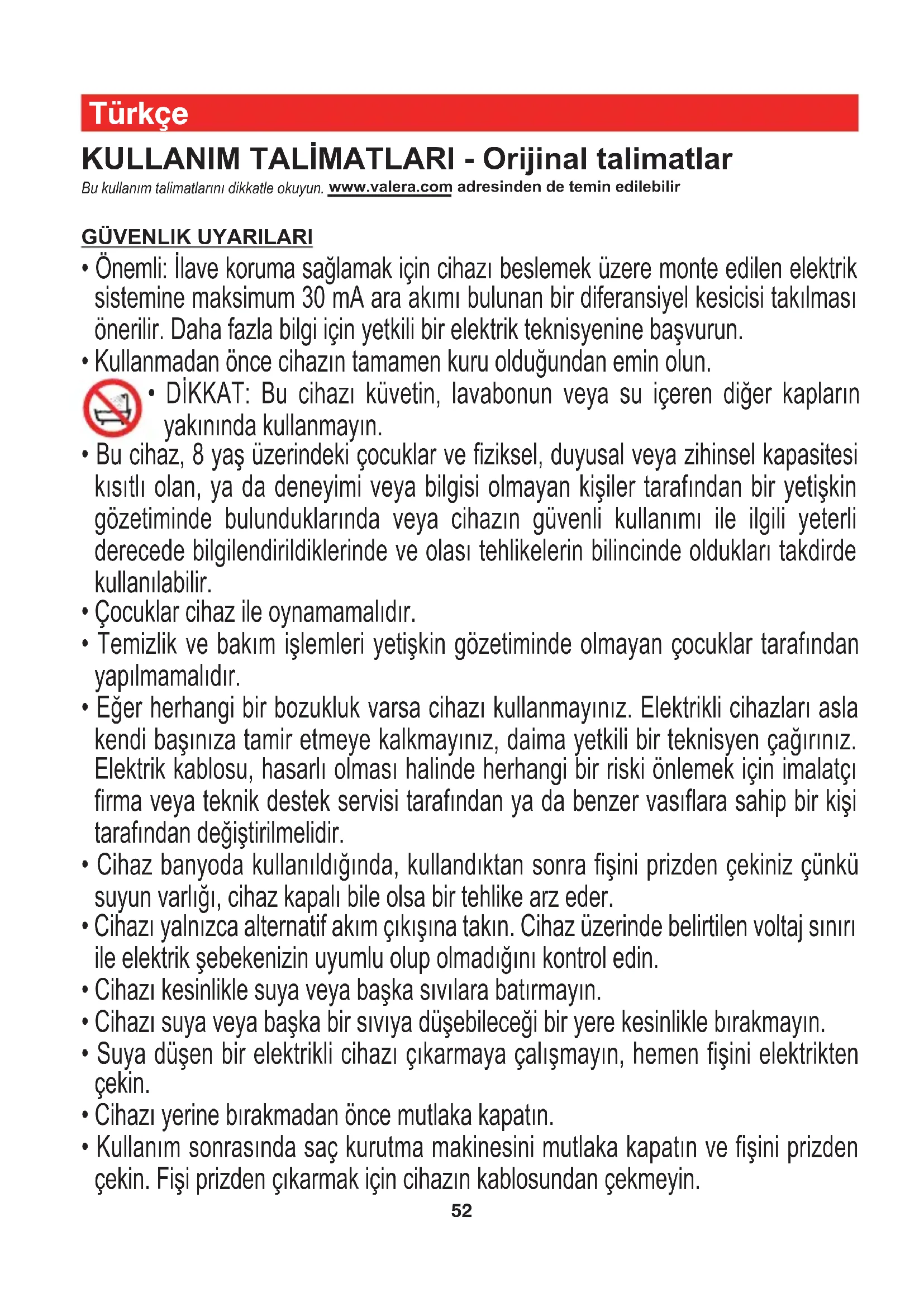 veya tamir edildiği taktirde, garanti süresi düşmektedir. Arıza olduğunda ürünü, iyi ambalajlanmış ve satıcı tarafından tarihi eklenerek mühürlenmiş olarak, yetkili yardım merkezimize geri getirebilir, ya da garantili onarım için resmi ithalatçıya gönderecek olan satıcınıza başvurabilirsiniz. Hava yoğunlaştırıcı Saçları hızlı bir şekilde kurutmak için ideal aksesuardır. Fırça yardımı ile en iyi sonuçların alınmasına olanak verir. Bu yoğunlaştırıcı sayesinde sıcak veya soğuk hava akımını tek bir saç tutamı üzerinde yoğunlaştırarak saçınıza istediğiniz şekli verebilirsiniz. Difüzör (bu aksesuarların bulunduğu cihazlar için) Saça hacim vermek ve kıvırcık veya permalı saçlara doğal bir yumuşaklık kazandırmak için ideal bir aksesuardır. Halen nemli haldeki (fakat ıslak olmayan) saç tutamlarını alın ve yukarıya doğru tutun, difüzörden gelen havanın parmaklarınızın arasından geçmesine izin vererek kurutun. Difüzörün montajı: bkz şekil 1 Dikkat: dağıtıcı parçayı alete taktığınızda sadece en düşük hız/ısı ayarında kurutma yapın. Filtre (bu aksesuarın bulunduğu modeller için) Saç kurutma makinesi, toz ve saç kalıntılarının fanda birikmesini önleyen, çıkarılabilir bir filtre ile donatılmıştır. Filtre su altına tutularak yıkanabilir. Filtreyi saç kurutma makinesinden çıkarmak için arkadaki hava giriş ızgarasını ayırmak yeterlidir. Filtreyi temizledikten sonra tekrar makineye takmadan önce tamamen kuru olmasına özen gösterin. Sonra arka ızgarayı makineye tekrar takın. Ionic Care (bu aygıtın bulunduğu saç kurutma makineleri için) Bu fonksiyon milyonlarca arındırıcı negatif iyon üreten bir jeneratör ile ilişkilidir. İyonlar nedir? İyonlar doğada bulunan elektrik yüklü partiküllerdir. Negatif yüklü iyonlar, kirletici maddelerin büyük bir kısmını atmosferde tutmak suretiyle havanın kirlenmesine katkıda bulunan pozitif yüklü iyonları nötrleştirerek, bunların tam tersine havanın temizlenmesine yardımcı olurlar. Saçlarınız için en iyi nemlendirme Negatif yüklü iyonlar saçtaki nemin gereken şekilde muhafaza edilmesine yardımcı olur. Bunlar esas olarak yeni yıkanmış saçların üzerinde bulunan su partiküllerini mikronize ederek saç telinin üzerinde daha fazla miktarda bir emilim sağlamak suretiyle saçın doğal nem dengesini düzenlerler. Saçta balsam etkisi Daha iyi nemlendirme saçlarınızın yumuşatılmasına yardımcı olur, canlandırıcı bir etkisi vardır ve saçları daha yumuşak ve kolay taranır kılmakla birlikte hacim ve ışıltı kazandırır. Elektrostatik yük veya “fly away” etkisi giderme Negatif yüklü iyonlar saçlardaki elektrostatik yükü ve “fly away” etkisini (kabarık saçlar) ve buruşukluğu azaltmaya yardımcı olurlar. VALERA tescilli bir LIGO PATENTS SA - İsviçre markasıdır.55 Українськa ІНСТРУКЦІЯ З ЕКСПЛУАТАЦІЇ - Оригінальні інструкції Уважно прочитайте цю інструкцію. Доступні також на сайті www.valera.com ПОПЕРЕДЖЕННЯ