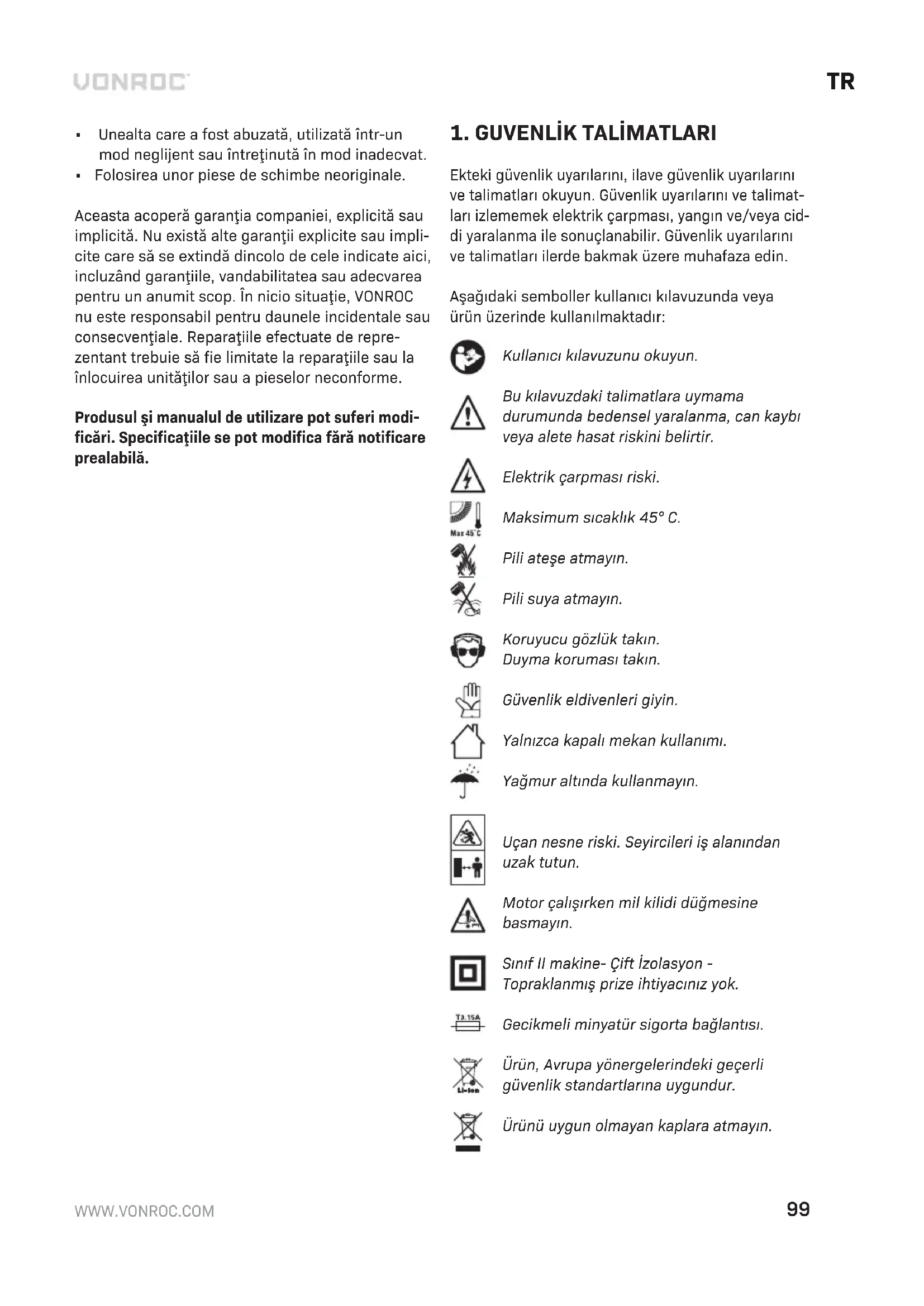 Bataryayı ısıya, sürekli yoğun güneş ışığına, yangı- na, suya ve neme karşı koruyun. Patlama tehlikesi. c) Bataryanın hasar görmesi ve yanlış kullanıl- ması durumunda duman çıkabilir. Bölgeyi havalandırın ve şikayet durumunda tıbbi yardım alın. Duman solunum sistemini tahriş edebilir. d) Bataryayı sadece Vonroc ürününüzle bağlantılı olarak kullanın. Bu önlem tek başına bataryayı104
