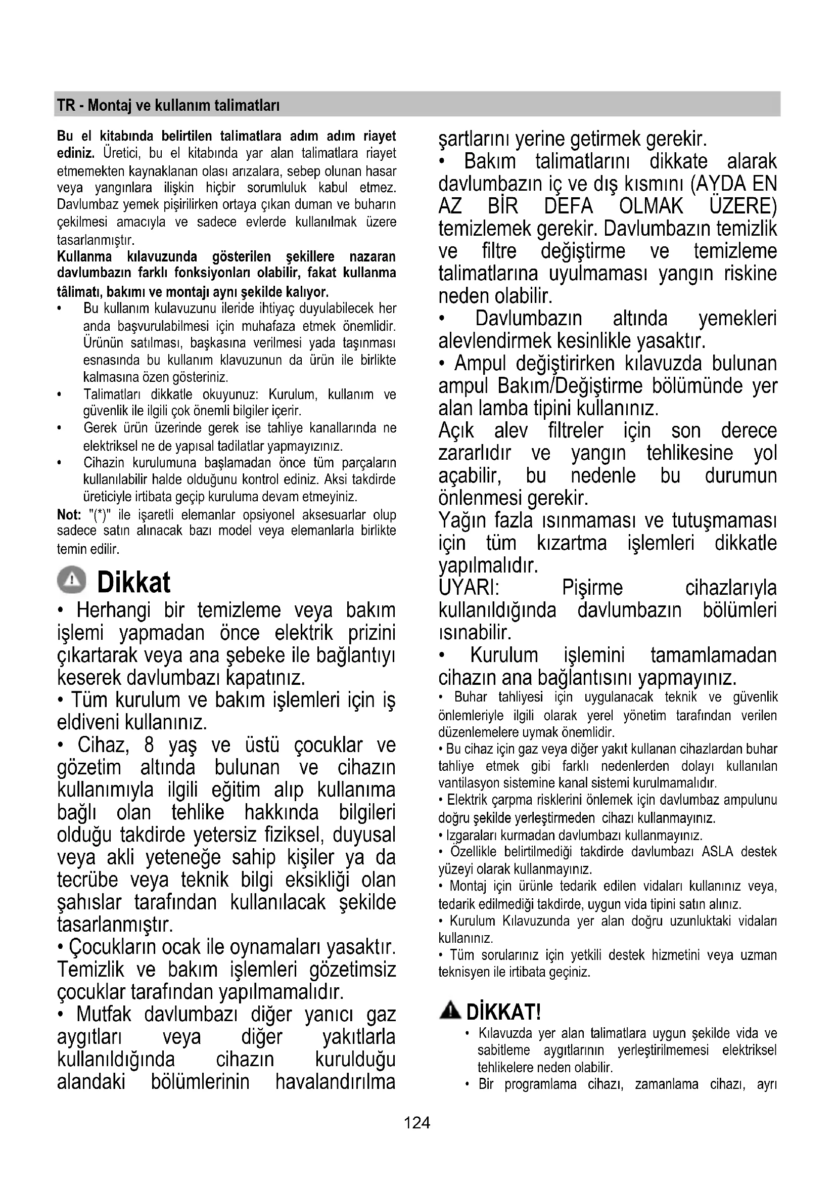 - Bakım talimatlarını dikkate alarak davlumbazın iç ve dış kısmını (AYDA EN AZ BİR DEFA OLMAK ÜZERE) temizlemek gerekir. Davlumbazın temizlik ve filtre değiştirme ve temizleme talimatlarına uyulmaması yangın riskine neden olabilir.