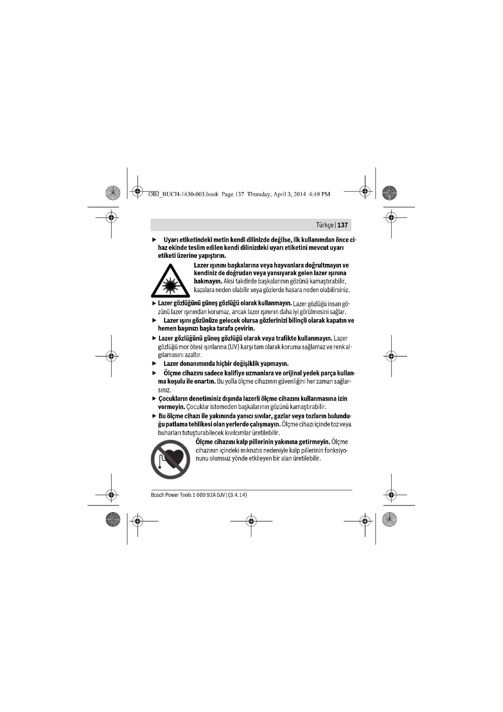 OBJ_BUCH-1630-003.book Page 135 Thursday, April 3, 2014 4:49 PM1 609 92A 0JV | (3.4.14) Bosch Power Tools 136 | Türkçe Μόνο για χώρες της ΕΕ: Σύμφωνα με την Κοινοτική Οδηγία 2012/19/EE τα άχρηστα ερ- γαλεία μέτρησης, και σύμφωνα με την Κοινοτική Οδηγία 2006/66/EΚ οι χαλασμένες ή αναλωμένες μπαταρίες δεν είναι πλέον υποχρεωτικό να συλλέγονται ξεχωριστά για να ανακυκλω- θούν με τρόπο φιλικό προς το περιβάλλον. Τηρούμε το δικαίωμα αλλαγών. Türkçe Güvenlik Talimatı Ölçme cihazı ile tehlikesiz ve güvenli biçimde çalışabilmek için bütün güvenlik talimatı ve uyarılar okunmalıdır. Ölçme ci- hazı üzerindeki uyarı etiketlerini hiçbir zaman okunamaz hale getirmeyin. BU TALİMATLARI İYİ VE GÜVENLİ BİR YERDE SAKLAYIN VE ÖLÇME CİHAZINI BAŞKASINA VERDİĞİNİZDE BUNLARI DA BİRLİKTE VERİN. Dikkat – Burada belirtilen kullanım veya ayar hükümlerine uyulmadığı veya başka yöntemler kullanıldığı takdirde cihazın çıkaracağı ışınlar kul- lanıcı için tehlikeli olabilir. Bu elektrikli el aleti bir uyarı etiketi ile teslim edilir (grafik sayfasındaki ölçme cihazının şekli üzerinde 7 numara ile gösterilmektedir). OBJ_BUCH-1630-003.book Page 136 Thursday, April 3, 2014 4:49 PMTürkçe | 137 Bosch Power Tools 1 609 92A 0JV | (3.4.14) Uyarı etiketindeki metin kendi dilinizde değilse, ilk kullanımdan önce ci- haz ekinde teslim edilen kendi dilinizdeki uyarı etiketini mevcut uyarı etiketi üzerine yapıştırın. Lazer ışınını başkalarına veya hayvanlara doğrultmayın ve kendiniz de doğrudan veya yansıyarak gelen lazer ışınına bakmayın. Aksi takdirde başkalarının gözünü kamaştırabilir, kazalara neden olabilir veya gözlerde hasara neden olabilirsiniz.