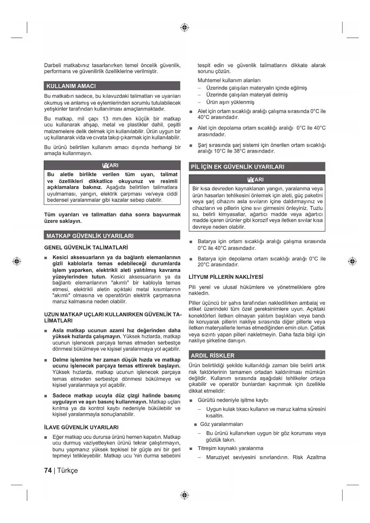 ■ Eğer matkap ucu durursa ürünü hemen kapatın. Matkap ucu durmuş vaziyetteyken ürünü tekrar çalıştırmayın, bunu yapmanız yüksek tepkisel bir güçle ani bir geri tepmeyi tetikleyebilir. Matkap ucu 'nin durma sebebini tespit edin ve güvenlik talimatlarını dikkate alarak sorunu çözün. Muhtemel kullanım alanları – Üzerinde çalışılan materyalin içinde eğilmiş – Üzerinde çalışılan materyali delmiş – Ürün aşırı yüklenmiş ■ Alet için ortam sıcaklığı aralığı çalışma sırasında 0°C ile 40°C arasındadır. ■ Alet için depolama ortam sıcaklığı aralığı 0°C ile 40°C arasındadır. ■ Şarj sırasında şarj sistemi için önerilen ortam sıcaklığı aralığı 10°C ile 38°C arasındadır. PİL İÇİN EK GÜVENLİK UYARILARI UYARI Bir kısa devreden kaynaklanan yangın, yaralanma veya ürün hasarları tehlikesini önlemek için aleti, güç paketini veya şarj cihazını asla sıvıların içine daldırmayınız ve cihazların ve pillerin içine sıvı girmesini önleyiniz. Tuzlu su, belirli kimyasallar, ağartıcı madde veya ağartıcı madde içeren ürünler gibi korozif veya iletken sıvılar kısa devreye neden olabilir. ■ Batarya için ortam sıcaklığı aralığı çalışma sırasında 0°C ile 40°C arasındadır. ■ Batarya için depolama ortam sıcaklığı aralığı 0°C ile 20°C arasındadır. LİTYUM PİLLERİN NAKLİYESİ Pili yerel ve ulusal hükümlere ve yönetmeliklere göre nakledin. Piller üçüncü bir şahıs tarafından nakledilirken ambalaj ve etiket üzerindeki tüm özel gereksinimlere uyun. Açıktaki konektörleri iletken olmayan yalıtım başlıkları veya bandı ile koruyarak pillerin nakliye sırasında diğer pillerle veya iletken materyallerle temas etmediğinden emin olun. Çatlak veya sızıntı yapan pilleri nakletmeyin. Daha fazla bilgi için nakliye şirketine danışın.