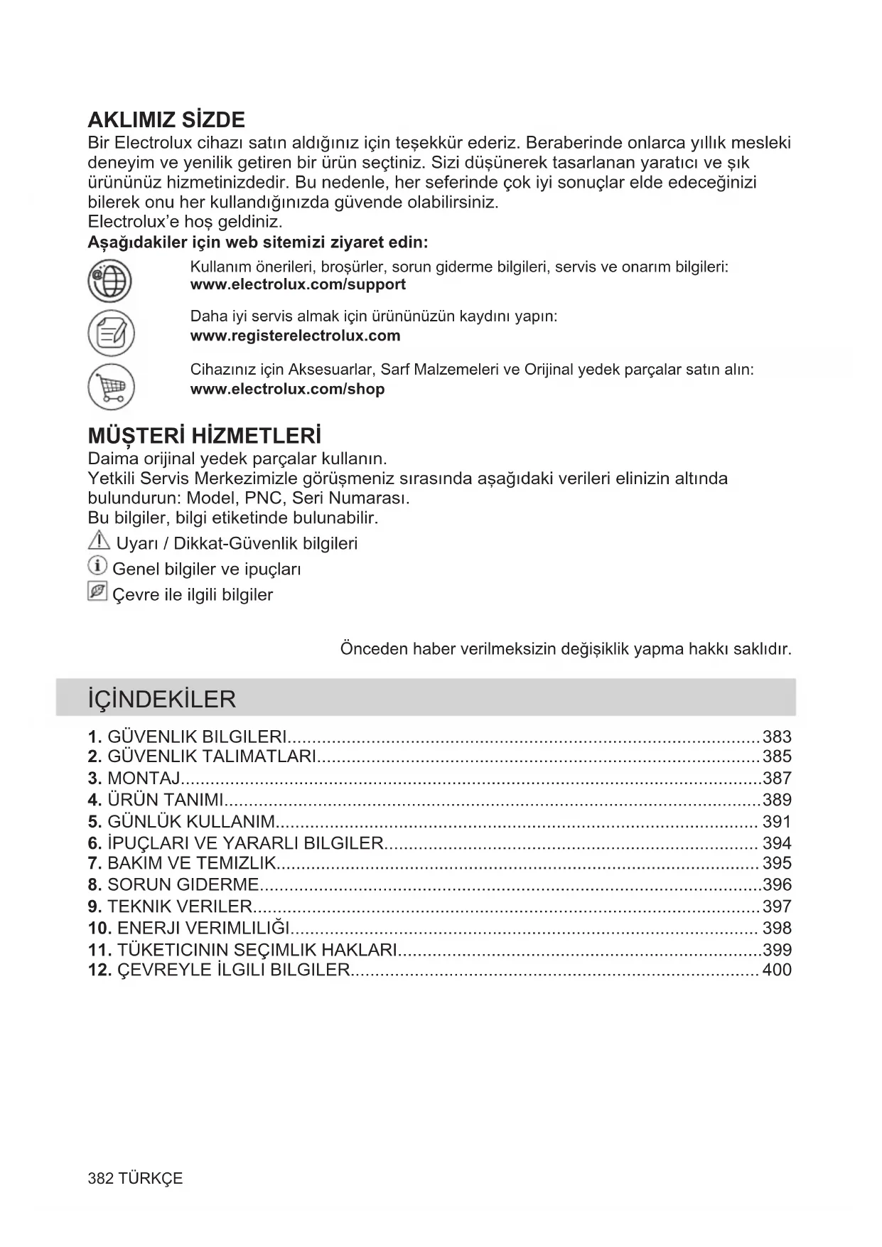 Bir Electrolux cihazı satın aldığınız için teşekkür ederiz. Beraberinde onlarca yıllık mesleki deneyim ve yenilik getiren bir ürün seçtiniz. Sizi düşünerek tasarlanan yaratıcı ve şık ürününüz hizmetinizdedir. Bu nedenle, her seferinde çok iyi sonuçlar elde edeceğinizi bilerek onu her kullandığınızda güvende olabilirsiniz. Electrolux’e hoş geldiniz. Aşağıdakiler için web sitemizi ziyaret edin: Kullanım önerileri, broşürler, sorun giderme bilgileri, servis ve onarım bilgileri: www.electrolux.com/support Daha iyi servis almak için ürününüzün kaydını yapın: www.registerelectrolux.com Cihazınız için Aksesuarlar, Sarf Malzemeleri ve Orijinal yedek parçalar satın alın: www.electrolux.com/shop