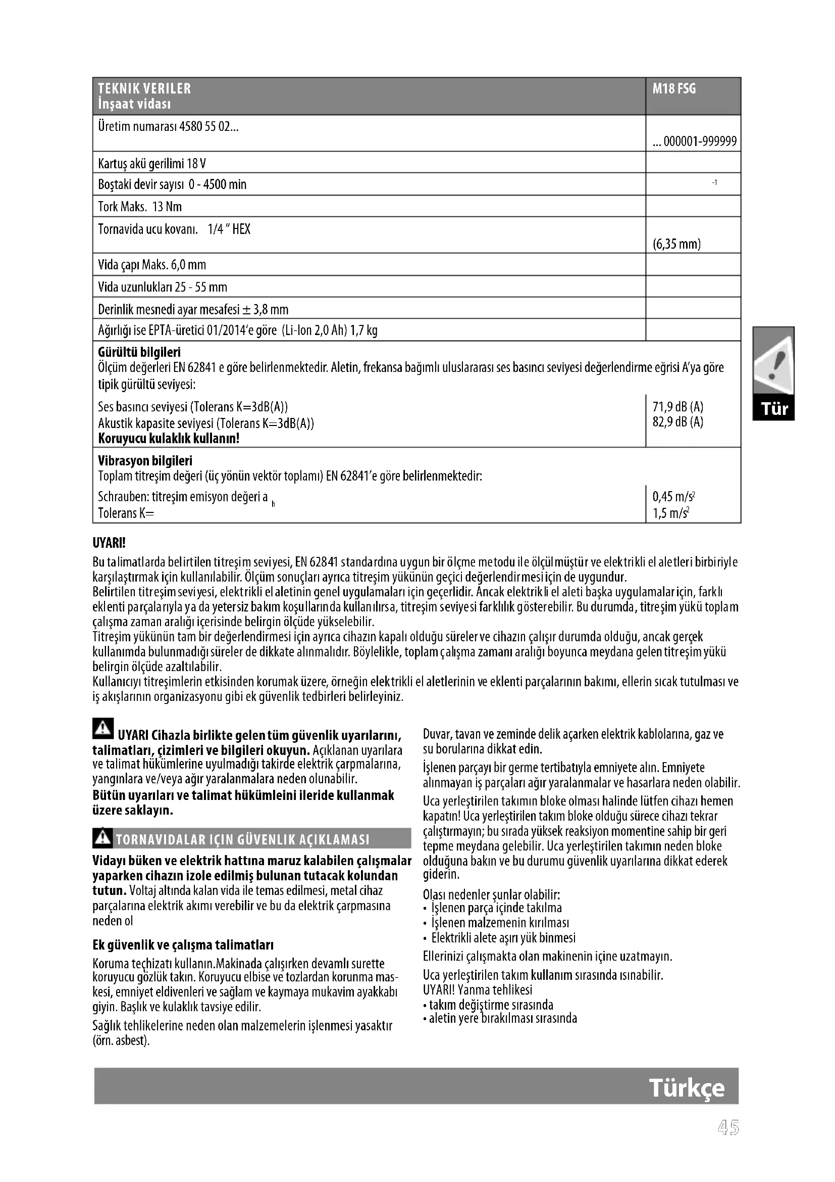 UYARI! Bu talimatlarda belirtilen titreşim seviyesi, EN 62841 standardına uygun bir ölçme metodu ile ölçülmüştür ve elektrikli el aletleri birbiriyle karşılaştırmak için kullanılabilir. Ölçüm sonuçları ayrıca titreşim yükünün geçici değerlendirmesi için de uygundur. Belirtilen titreşim seviyesi, elektrikli el aletinin genel uygulamaları için geçerlidir. Ancak elektrikli el aleti başka uygulamalar için, farklı eklenti parçalarıyla ya da yetersiz bakım koşullarında kullanılırsa, titreşim seviyesi farklılık gösterebilir. Bu durumda, titreşim yükü toplam çalışma zaman aralığı içerisinde belirgin ölçüde yükselebilir. Titreşim yükünün tam bir değerlendirmesi için ayrıca cihazın kapalı olduğu süreler ve cihazın çalışır durumda olduğu, ancak gerçek kullanımda bulunmadığı süreler de dikkate alınmalıdır. Böylelikle, toplam çalışma zamanı aralığı boyunca meydana gelen titreşim yükü belirgin ölçüde azaltılabilir. Kullanıcıyı titreşimlerin etkisinden korumak üzere, örneğin elektrikli el aletlerinin ve eklenti parçalarının bakımı, ellerin sıcak tutulması ve iş akışlarının organizasyonu gibi ek güvenlik tedbirleri belirleyiniz. UYARI Cihazla birlikte gelen tüm güvenlik uyarılarını, talimatları, çizimleri ve bilgileri okuyun. Açıklanan uyarılara ve talimat hükümlerine uyulmadığı takirde elektrik çarpmalarına, yangınlara ve/veya ağır yaralanmalara neden olunabilir. Bütün uyarıları ve talimat hükümleini ileride kullanmak üzere saklayın. TORNAVIDALAR IÇIN GÜVENLIK AÇIKLAMASI Vidayı büken ve elektrik hattına maruz kalabilen çalışmalar yaparken cihazın izole edilmiş bulunan tutacak kolundan tutun. Voltaj altında kalan vida ile temas edilmesi, metal cihaz parçalarına elektrik akımı verebilir ve bu da elektrik çarpmasına neden ol Ek güvenlik ve çalışma talimatları Koruma teçhizatı kullanın.Makinada çalışırken devamlı surette koruyucu gözlük takın. Koruyucu elbise ve tozlardan korunma mas- kesi, emniyet eldivenleri ve sağlam ve kaymaya mukavim ayakkabı giyin. Başlık ve kulaklık tavsiye edilir. Sağlık tehlikelerine neden olan malzemelerin işlenmesi yasaktır (örn. asbest). Duvar, tavan ve zeminde delik açarken elektrik kablolarına, gaz ve su borularına dikkat edin. İşlenen parçayı bir germe tertibatıyla emniyete alın. Emniyete alınmayan iş parçaları ağır yaralanmalar ve hasarlara neden olabilir. Uca yerleştirilen takımın bloke olması halinde lütfen cihazı hemen kapatın! Uca yerleştirilen takım bloke olduğu sürece cihazı tekrar çalıştırmayın; bu sırada yüksek reaksiyon momentine sahip bir geri tepme meydana gelebilir. Uca yerleştirilen takımın neden bloke olduğuna bakın ve bu durumu güvenlik uyarılarına dikkat ederek giderin. Olası nedenler şunlar olabilir: