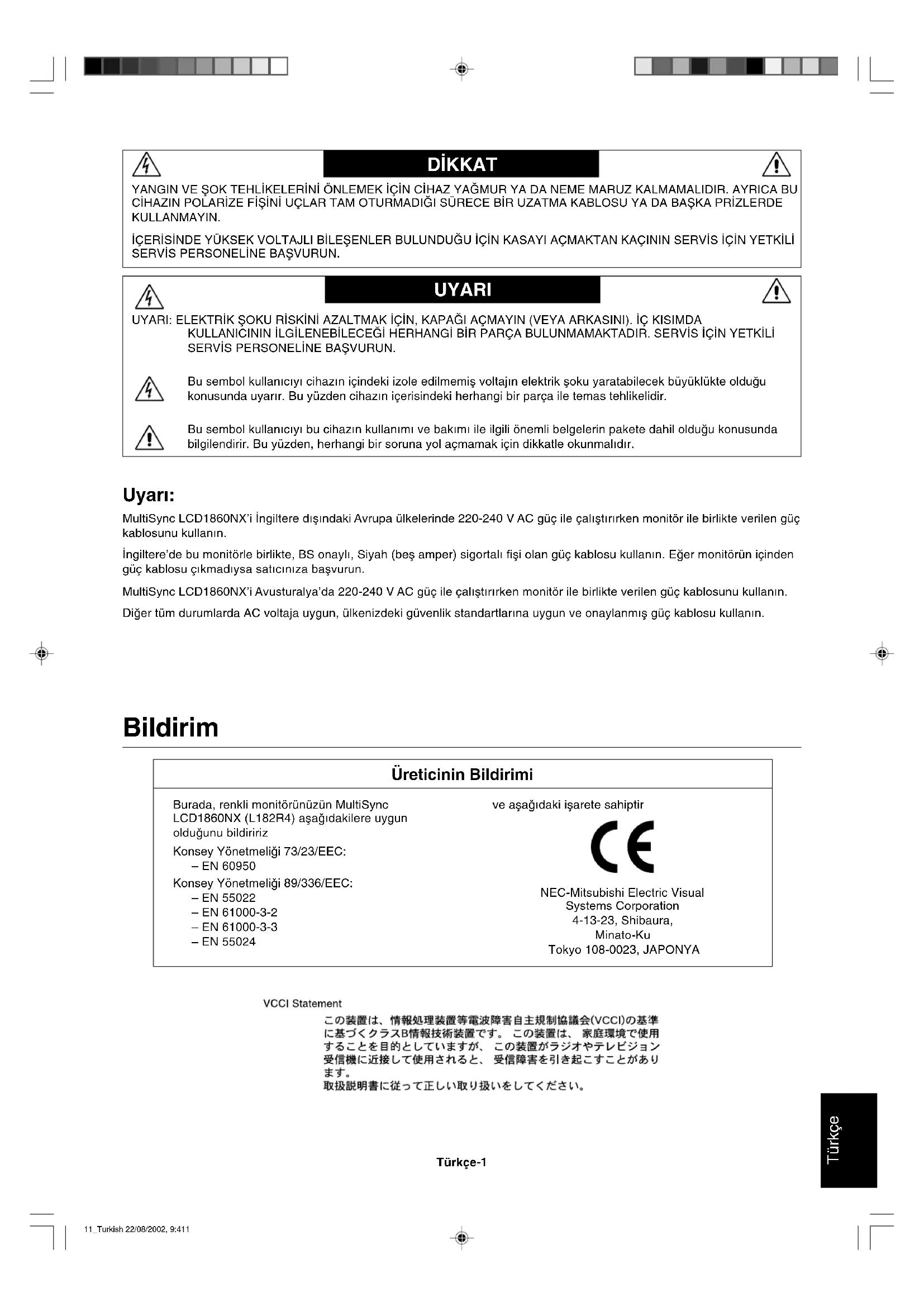 - Не используйте синий цвет в качестве основного цвета на темном фоне, так как недостаточная контрастность приводит к зрительному утомлению и быстрой усталости глаз. 10_Russian 22/08/2002, 9:4110Türkçe Türkçe-1 Bildirim Üreticinin Bildirimi YANGIN VE ΩOK TEHL∑KELER∑N∑ ÖNLEMEK ∑Ç∑N C∑HAZ YA∏MUR YA DA NEME MARUZ KALMAMALIDIR. AYRICA BU C∑HAZIN POLAR∑ZE F∑Ω∑N∑ UÇLAR TAM OTURMADI∏I SÜRECE B∑R UZATMA KABLOSU YA DA BAΩKA PR∑ZLERDE KULLANMAYIN. ∑ÇER∑S∑NDE YÜKSEK VOLTAJLI B∑LEΩENLER BULUNDU∏U ∑Ç∑N KASAYI AÇMAKTAN KAÇININ SERV∑S ∑Ç∑N YETK∑L∑ SERV∑S PERSONEL∑NE BAΩVURUN. D∑KKAT UYARI UYARI: ELEKTR∑K ΩOKU R∑SK∑N∑ AZALTMAK ∑Ç∑N, KAPA∏I AÇMAYIN (VEYA ARKASINI). ∑Ç KISIMDA KULLANICININ ∑LG∑LENEB∑LECE∏∑ HERHANG∑ B∑R PARÇA BULUNMAMAKTADIR. SERV∑S ∑Ç∑N YETK∑L∑ SERV∑S PERSONEL∑NE BAΩVURUN. Bu sembol kullan∂c∂y∂ cihaz∂n içindeki izole edilmemiµ voltaj∂n elektrik µoku yaratabilecek büyüklükte olduπu konusunda uyar∂r. Bu yüzden cihaz∂n içerisindeki herhangi bir parça ile temas tehlikelidir. Bu sembol kullan∂c∂y∂ bu cihaz∂n kullan∂m∂ ve bak∂m∂ ile ilgili önemli belgelerin pakete dahil olduπu konusunda bilgilendirir. Bu yüzden, herhangi bir soruna yol açmamak için dikkatle okunmal∂d∂r. Burada, renkli monitörünüzün MultiSync LCD1860NX (L182R4) aµa©∂dakilere uygun oldu©unu bildiririz Konsey Yönetmeli©i 73/23/EEC: – EN 60950 Konsey Yönetmeli©i 89/336/EEC: – EN 55022 – EN 61000-3-2 – EN 61000-3-3 – EN 55024 ve aµa©∂daki iµarete sahiptir NEC-Mitsubishi Electric Visual Systems Corporation 4-13-23, Shibaura, Minato-Ku Tokyo 108-0023, JAPONYA Uyar∂: MultiSync LCD1860NX’i ∑ngiltere d∂µ∂ndaki Avrupa ülkelerinde 220-240 V AC güç ile çal∂µt∂r∂rken monitör ile birlikte verilen güç kablosunu kullan∂n. ∑ngiltere’de bu monitörle birlikte, BS onayl∂, Siyah (beµ amper) sigortal∂ fiµi olan güç kablosu kullan∂n. Eπer monitörün içinden güç kablosu ç∂kmad∂ysa sat∂c∂n∂za baµvurun. MultiSync LCD1860NX’i Avusturalya’da 220-240 V AC güç ile çal∂µt∂r∂rken monitör ile birlikte verilen güç kablosunu kullan∂n. Diπer tüm durumlarda AC voltaja uygun, ülkenizdeki güvenlik standartlar∂na uygun ve onaylanm∂µ güç kablosu kullan∂n. 11_Turkish 22/08/2002, 9:411Türkçe-2 MultiSync LCD1860NX ∑çindekiler Yeni NEC MultiSync LCD monitör kutunuz* aµa©∂dakileri içermelidir: