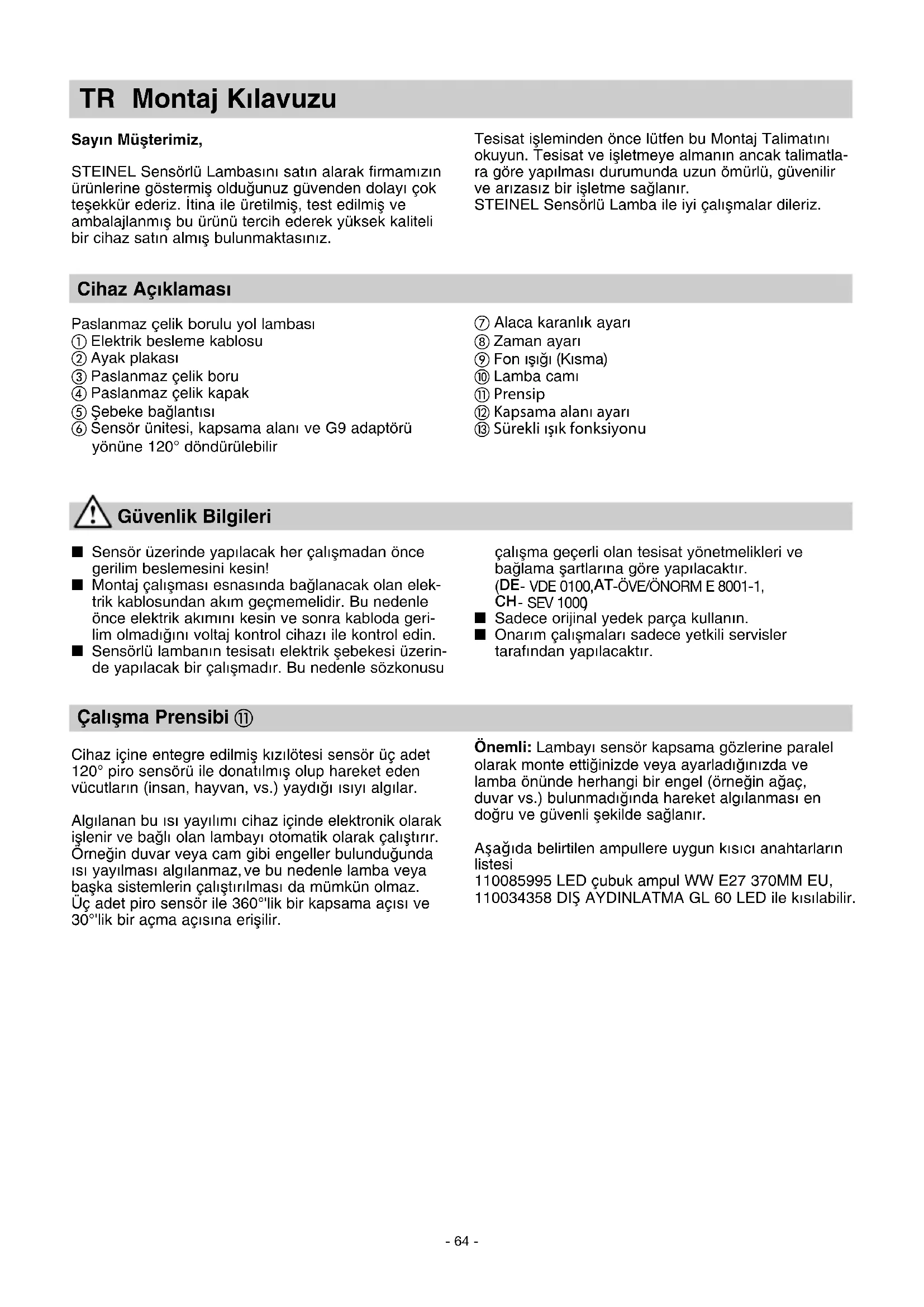 Μόνο για χώρες ΕΕ: Σύμφωνα με την ισχύουσα Ευρωπαϊκή Οδηγία σχετικά με άχρη-στες ηλεκτρικές και ηλεκτρονικές συσκευές και την εφαρμογή της σε εθνικό δίκαιο πρέπει οι άχρηστες πλέον ηλεκτρικές συσκευές να αποσύρονται ξεχωριστά και να οδηγούνται σε ανακύκλωση φιλική προς το περιβάλλον. Δυνατότητα αντικατάστασης πηγής φωτός από τελικό καταναλωτή. GR- 64 - Çal›flma Prensibi 햽 Cihaz içine entegre edilmifl k›z›lötesi sensör üç adet 120° piro sensörü ile donat›lm›fl olup hareket eden vücutlar›n (insan, hayvan, vs.) yayd›¤› ›s›y› alg›lar. Alg›lanan bu ›s› yay›l›m› cihaz içinde elektronik olarak ifllenir ve ba¤l› olan lambay› otomatik olarak çal›flt›r›r. Örne¤in duvar veya cam gibi engeller bulundu¤unda ›s› yay›lmas› alg›lanmaz, ve bu nedenle lamba veya baflka sistemlerin çal›flt›r›lmas› da mümkün olmaz. Üç adet piro sensör ile 360°'lik bir kapsama aç›s› ve 30°'lik bir açma aç›s›na eriflilir. Cihaz Aç›klamas› Paslanmaz çelik borulu yol lambası 햲 Elektrik besleme kablosu 햳 Ayak plakas› 햴 Paslanmaz çelik boru 햵 Paslanmaz çelik kapak 햶 fiebeke ba¤lant›s› 햷 Sensör ünitesi, kapsama alan› ve G9 adaptörü yönüne 120° döndürülebilir TR Montaj K›lavuzu Say›n Müflterimiz, STEINEL Sensörlü Lambas›n› sat›n alarak firmam›z›n ürünlerine göstermifl oldu¤unuz güvenden dolay› çok teflekkür ederiz. ‹tina ile üretilmifl, test edilmifl ve ambalajlanm›fl bu ürünü tercih ederek yüksek kaliteli bir cihaz sat›n alm›fl bulunmaktas›n›z. Güvenlik Bilgileri n Sensör üzerinde yap›lacak her çal›flmadan önce gerilim beslemesini kesin! n Montaj çal›flmas› esnas›nda ba¤lanacak olan elek- trik kablosundan ak›m geçmemelidir. Bu nedenle önce elektrik ak›m›n› kesin ve sonra kabloda geri- lim olmad›¤›n› voltaj kontrol cihaz› ile kontrol edin. n Sensörlü lamban›n tesisat› elektrik flebekesi üzerin- de yap›lacak bir çal›flmad›r. Bu nedenle sözkonusu Tesisat iflleminden önce lütfen bu Montaj Talimat›n› okuyun. Tesisat ve iflletmeye alman›n ancak talimatla- ra göre yap›lmas› durumunda uzun ömürlü, güvenilir ve ar›zas›z bir iflletme sa¤lan›r. STEINEL Sensörlü Lamba ile iyi çal›flmalar dileriz. 햸 Alaca karanl›k ayar› 햹 Zaman ayar› 햺 Fon ışığı (Kısma) 햻 Lamba cam› 햽 Prensip 햾 Kapsama alanı ayarı 햿 Sürekli ışık fonksiyonu Önemli: Lambay› sensör kapsama gözlerine paralel olarak monte etti¤inizde veya ayarlad›¤›n›zda ve lamba önünde herhangi bir engel (örne¤in a¤aç, duvar vs.) bulunmad›¤›nda hareket alg›lanmas› en do¤ru ve güvenli flekilde sa¤lan›r. Aşağıda belirtilen ampullere uygun kısıcı anahtarların listesi 110085995 LED çubuk ampul WW E27 370MM EU, 110034358 DIŞ AYDINLATMA GL 60 LED ile kısılabilir. çal›flma geçerli olan tesisat yönetmelikleri ve ba¤lama flartlar›na göre yap›lacakt›r.