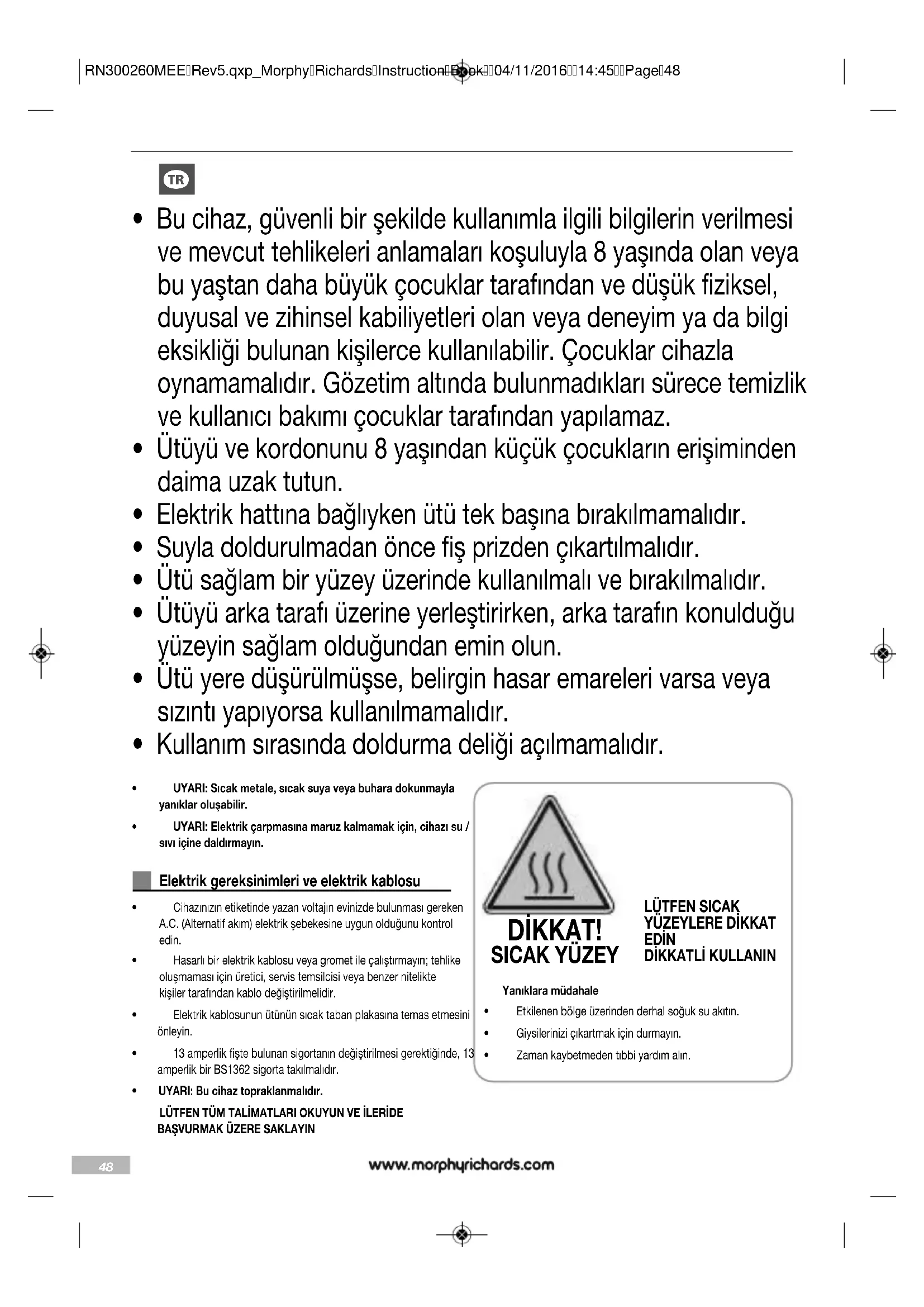 Ütülemeyi bitirdiğinizde ütünün fişini prizden çıkarın, ütünüzdeki tüm suyu boşaltın ve buhar düğmesini ‘’konumuna ayarlayın. Ütüyü soğuduğunda kordonunu gevşek bir şekilde arka tarafına sararak arkalığında saklayın. Kendi Kendini Temizleme Ütünüz su valfini, buhar haznesini ve buhar çıkışlarını tiftiklerden ve gevşek mineral kalıntılarından uzak tutmak için tasarlanmış yerleşik bir temizleme sistemine sahiptir. 1 Ütüyü yarısına kadar suyla doldurun. 2 Ütüyü arkalığına yerleştirin. 3 Değiştirilebilir buhar düğmesini (1) ‘MAX’ konumuna getirin. 4 Bir elektrik prizine bağlayın. 5 Sıcaklık ayar düğmesini (9) ‘MAX’ konumuna ayarlayın. “Buharlı ütüleme için ütüyü kullanma” adım 2’ye bakın. 6 Sıcaklık gösterge ışığı (10) gerekli sıcaklığa ulaşılana kadar yanacak ve ardından sönecektir. Bir devir daha bekleyin - sıcaklık gösterge ışığı yanar ve söner. 7 Ütüyü elektrik prizinden çıkarın. 8 Hala çok sıcakken ütüyü lavabo üzerinde yatay şekilde tutun. RN300260MEERev5.qxp_MorphyRichardsInstructionBook04/11/201614:45Page5051 9 Kendi kendini temizleme konumunda değiştirilebilir buhar düğmesi (1) hala basılıyken su haznesi boşalana kadar ütüyü hafifçe ileriye ve geriye doğru hareket ettirin. UYARI: Buhar ve kaynayan sıcak su taban plakasındaki deliklerden boşalır. Böylece buhar haznesinde oluşan kireç ve mineraller temizlenir. 10 Temizleme tamamlandığında değiştirilebilir buhar düğmesini ‘O’ konumuna getirin. 11 Buharlı ütünüzü arka tarafı üzerine koyun ve tamamen soğumasını sağlayın. 12 Taban plakasını (6) soğuk, nemli bir bezle silin. Bu temizlik işleminden sonra kalan tüm suyu boşaltın. UYARI: Ellerinizi ve vücudunuzu sıcak sudan uzak tutun. UYARI: Taban plakasını kireç çözücü ürünlerle kireçten arındırmaya çalışmayın. Bizimle irtibata geçin Yardım hattı Cihazınızla ilgili herhangi bir sorununuz varsa, cihazı satın aldığınız mağazadan daha fazla yardım sağlayabileceğimizden lütfen Yardım Hattımızı arayın. Sorularınıza daha hızlı yanıt verebilmemize yardımcı olmak için bizi aradığınızda, lütfen ürün adı, model numarası ve seri numarasını hazır bulundurun. Bize danışın Sorularınız ve yorumlarınız veya ürünlerinizden etkili şekilde yararlanmanızı sağlayacak ilginç ipuçları için bize çevrimiçi ulaşın: Blog: www.morphyrichards.co.uk/blog Facebook: www.facebook.com/morphyrichardsuk Twitter: www.twitter.com/loveyourmorphy Web sitesi: www.morphyrichards.com