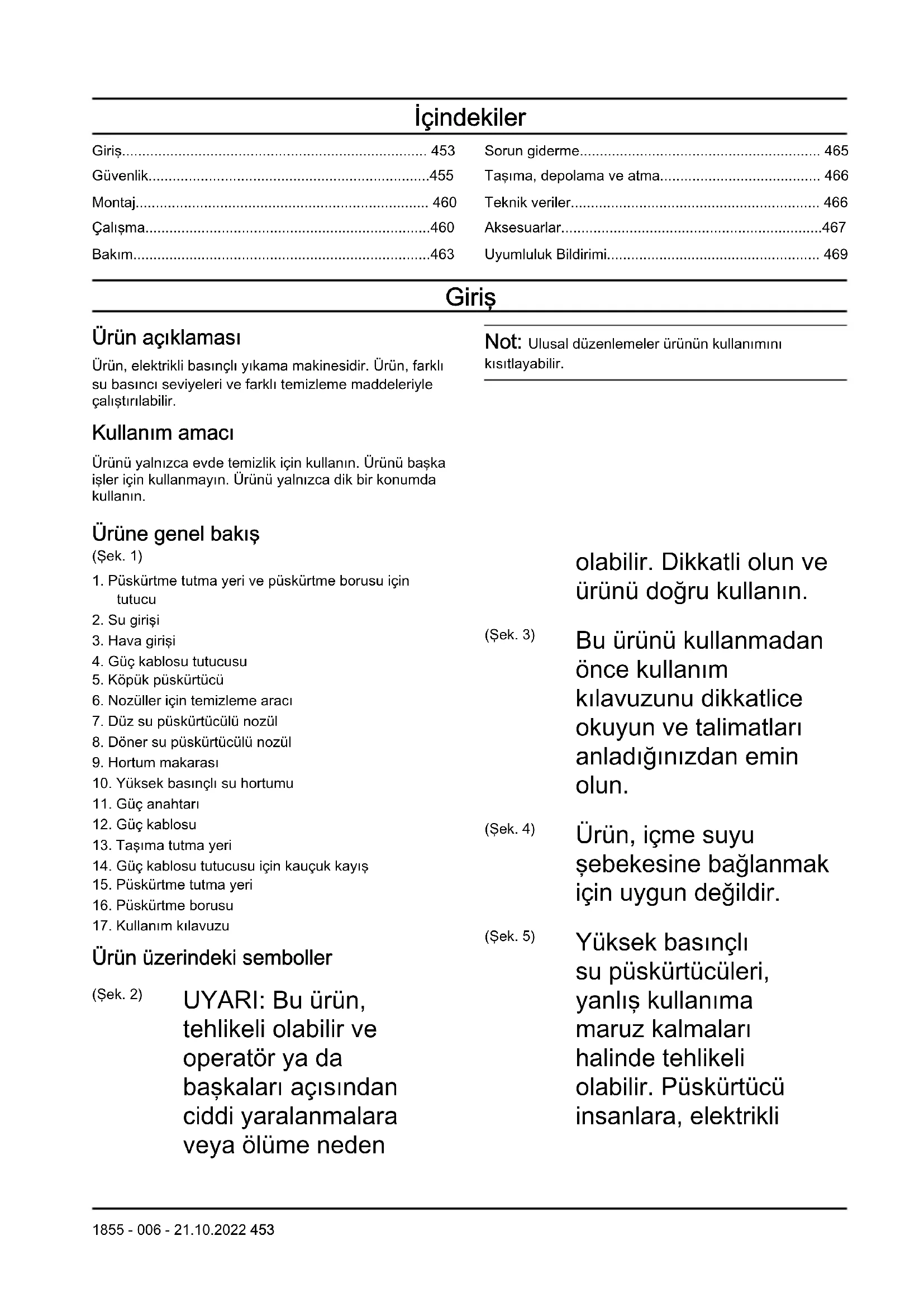 - Uyumluluk Bildirimi Giriş Ürün açıklaması Ürün, elektrikli basınçlı yıkama makinesidir. Ürün, farklı su basıncı seviyeleri ve farklı temizleme maddeleriyle çalıştırılabilir. Kullanım amacı Ürünü yalnızca evde temizlik için kullanın. Ürünü başka işler için kullanmayın. Ürünü yalnızca dik bir konumda kullanın. Not: Ulusal düzenlemeler ürünün kullanımını kısıtlayabilir. Ürüne genel bakış (Şek. 1) p. 469