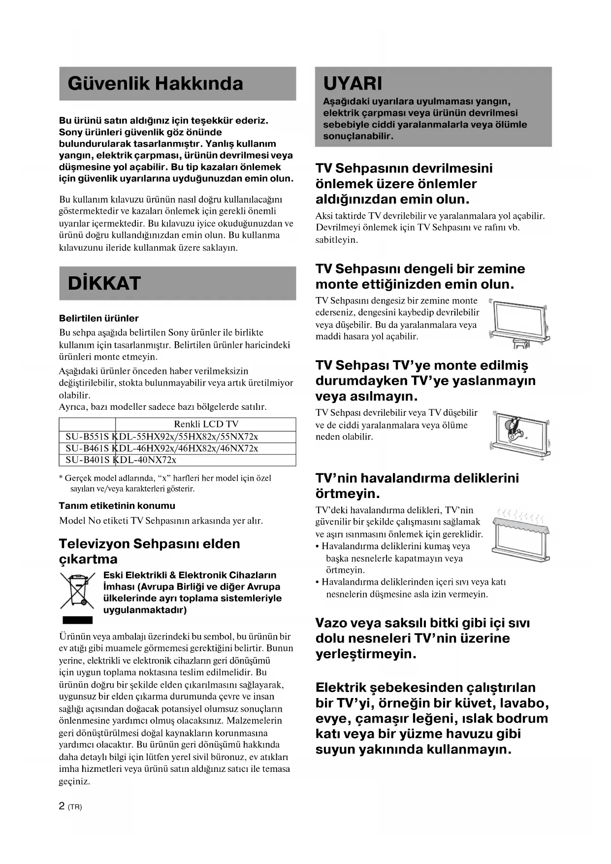 - Gerçek model adlarında, “x” harfleri her model için özel sayıları ve/veya karakterleri gösterir. Tanım etiketinin konumu Model No etiketi TV Sehpasının arkasında yer alır. Televizyon Sehpasını elden çıkartma Eski Elektrikli & Elektronik Cihazların İmhası (Avrupa Birliği ve diğer Avrupa ülkelerinde ayrı toplama sistemleriyle uygulanmaktadır) Ürünün veya ambalajı üzerindeki bu sembol, bu ürünün bir ev atığı gibi muamele görmemesi gerektiğini belirtir. Bunun yerine, elektrikli ve elektronik cihazların geri dönüşümü için uygun toplama noktasına teslim edilmelidir. Bu ürünün doğru bir şekilde elden çıkarılmasını sağlayarak, uygunsuz bir elden çıkarma durumunda çevre ve insan sağlığı açısından doğacak potansiyel olumsuz sonuçların önlenmesine yardımcı olmuş olacaksınız. Malzemelerin geri dönüştürülmesi doğal kaynakların korunmasına yardımcı olacaktır. Bu ürünün geri dönüşümü hakkında daha detaylı bilgi için lütfen yerel sivil büronuz, ev atıkları imha hizmetleri veya ürünü satın aldığınız satıcı ile temasa geçiniz. TV Sehpasının devrilmesini önlemek üzere önlemler aldığınızdan emin olun. Aksi taktirde TV devrilebilir ve yaralanmalara yol açabilir. Devrilmeyi önlemek için TV Sehpasını ve rafını vb. sabitleyin. TV Sehpasını dengeli bir zemine monte ettiğinizden emin olun. TV Sehpasını dengesiz bir zemine monte ederseniz, dengesini kaybedip devrilebilir veya düşebilir. Bu da yaralanmalara veya maddi hasara yol açabilir. TV Sehpası TV’ye monte edilmiş durumdayken TV’ye yaslanmayın veya asılmayın. TV Sehpası devrilebilir veya TV düşebilir ve de ciddi yaralanmalara veya ölüme neden olabilir. TV’nin havalandırma deliklerini örtmeyin. TV’deki havalandırma delikleri, TV’nin güvenilir bir şekilde çalışmasını sağlamak ve aşırı ısınmasını önlemek için gereklidir.