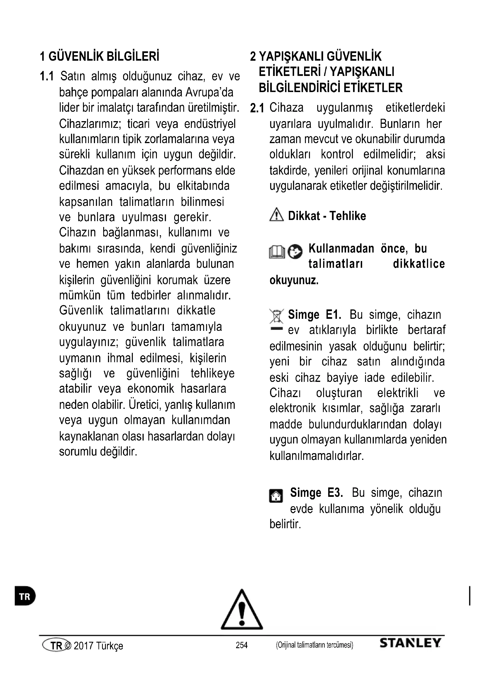 Cihaza uygulanmış etiketlerdeki uyarılara uyulmalıdır. Bunların her zaman mevcut ve okunabilir durumda oldukları kontrol edilmelidir; aksi takdirde, yenileri orijinal konumlarına uygulanarak etiketler değiştirilmelidir. Dikkat - Tehlike Kullanmadan önce, bu talimatları dikkatlice okuyunuz. Simge E1. Bu simge, cihazın ev atıklarıyla birlikte bertaraf edilmesinin yasak olduğunu belirtir; yeni bir cihaz satın alındığında eski cihaz bayiye iade edilebilir. Cihazı oluşturan elektrikli ve elektronik kısımlar, sağlığa zararlı madde bulundurduklarından dolayı uygun olmayan kullanımlarda yeniden kullanılmamalıdırlar. Simge E3. Bu simge, cihazın evde kullanıma yönelik olduğu belirtir.255 (Orijinal talimatların tercümesi) Türkçe (Orijinal talimatların tercümesi) TR © 2017 Türkçe