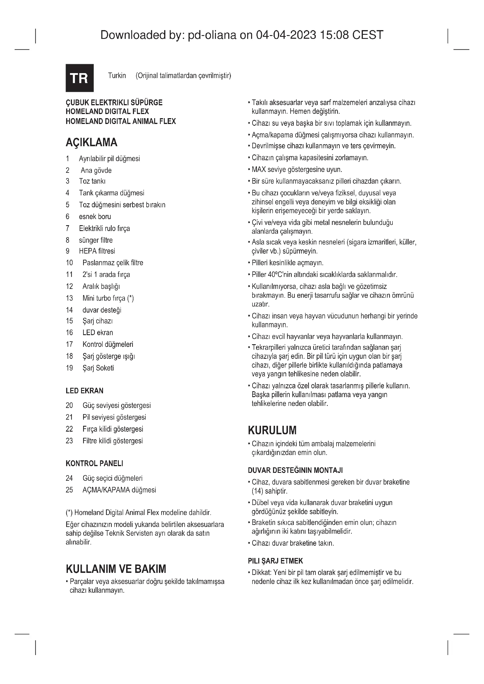 AÇIKLAMA 1 Ayrılabilirpildüğmesi 2 Anagövde 3 Toztankı 4 Tankçıkarmadüğmesi 5 Tozdüğmesiniserbestbırakın 6 esnekboru 7 Elektriklirulofırça 8 süngerltre 9 HEPAltresi 10 Paslanmazçelikltre 11 2'si1aradafırça 12 Aralıkbaşlığı 13 Miniturbofırça(*) 14 duvardesteği 15 Şarjcihazı 16 LEDekran 17 Kontroldüğmeleri 18 Şarjgöstergeışığı 19 ŞarjSoketi LED EKRAN 20 Güçseviyesigöstergesi 21 Pilseviyesigöstergesi 22 Fırçakilidigöstergesi 23 Filtrekilidigöstergesi KONTROL PANELI 24 Güçseçicidüğmeleri 25 AÇMA/KAPAMAdüğmesi (*)HomelandDigitalAnimalFlexmodelinedahildir. Eğercihazınızınmodeliyukarıdabelirtilenaksesuarlara sahipdeğilseTeknikServistenayrıolarakdasatın alınabilir.