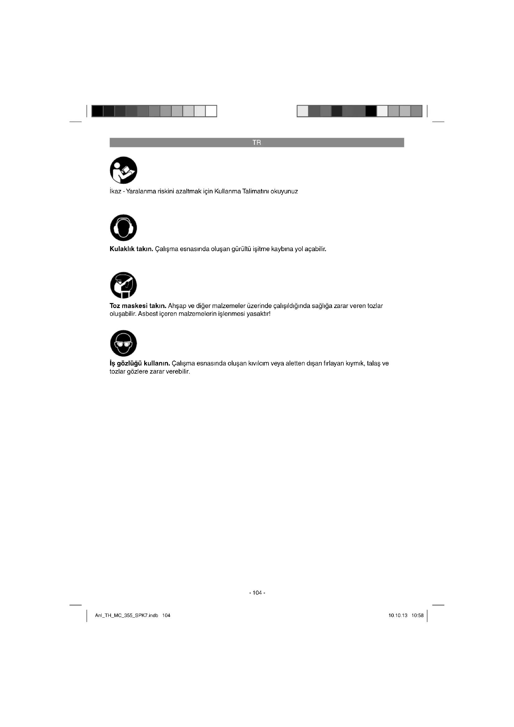 İkaz - Yaralanma riskini azaltmak için Kullanma Talimatını okuyunuz Kulaklık takın. Çalışma esnasında oluşan gürültü işitme kaybına yol açabilir. İş gözlüğü kullanın. Çalışma esnasında oluşan kıvılcım veya aletten dışarı fırlayan kıymık, talaş ve tozlar gözlere zarar verebilir. Toz maskesi takın. Ahşap ve diğer malzemeler üzerinde çalışıldığında sağlığa zarar veren tozlar oluşabilir. Asbest içeren malzemelerin işlenmesi yasaktır! Anl_TH_MC_355_SPK7.indb 104Anl_TH_MC_355_SPK7.indb 104 10.10.13 10:5810.10.13 10:58TR
