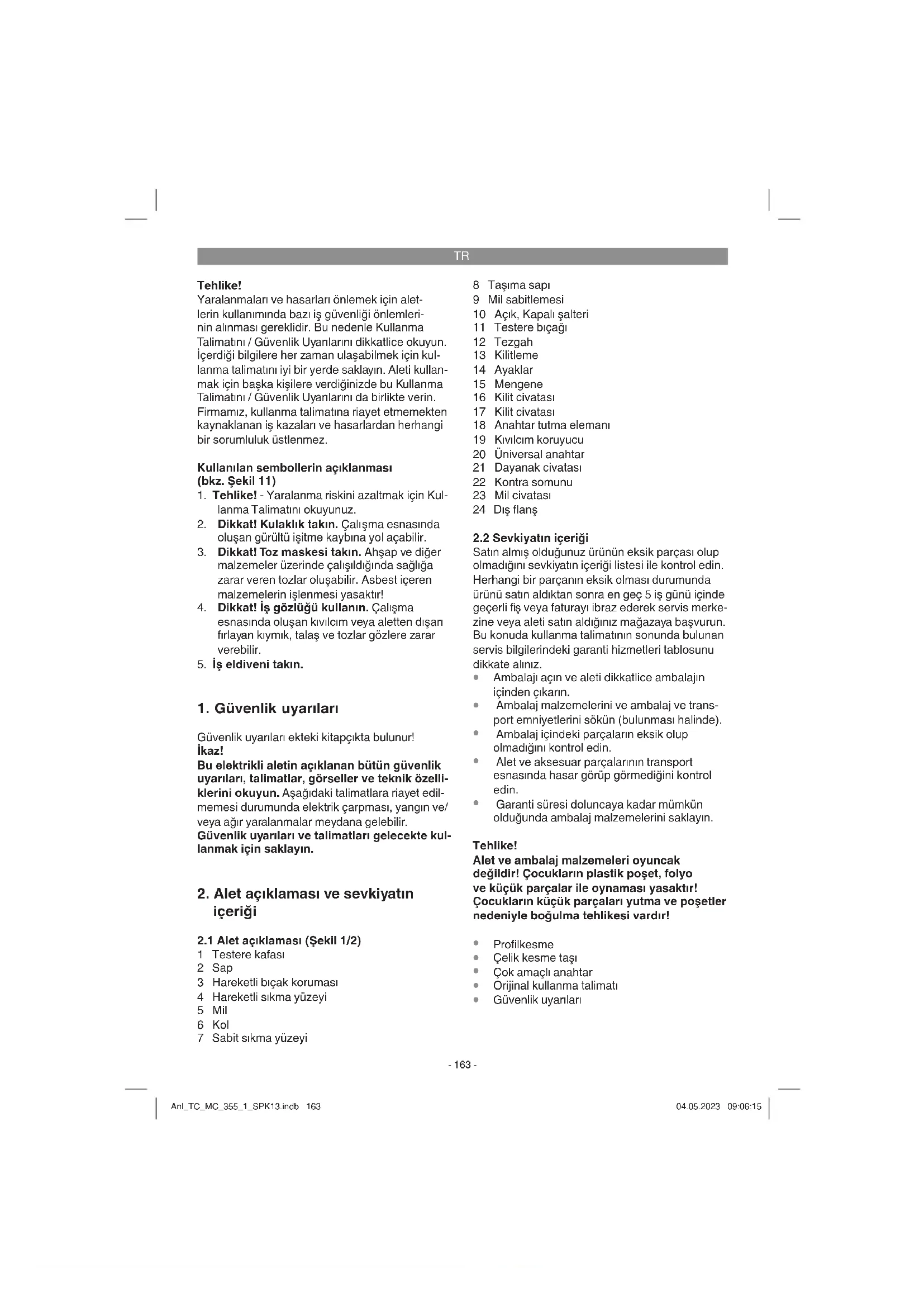 bildirin. Kasa fi şi veya yeni aletinizi satın aldığınızı belgeleyen diğer bir evrağı hazır tutun. Kasa fi şi veya tip etiketi olmaksızın gönderilen aletler, aletin tam olarak tanımlanma olanağının bulunmaması nedeniyle garanti hizmetleri dışındadır. Aletinizin arızası garanti hizmetleri kapsamındaysa en kısa zamanda onarılmış veya yeni bir alet adresinize gönderilecektir. Ayrıca garanti kapsamına dahil olmayan veya garanti süresi dolan arızaları ücreti karşılığında memnuniy- etle onarırız. Bunun için aleti lütfen Servis adresimize gönderin. Aşınma, sarf ve eksik parçalar için bu Kullanma Talimatının servis bilgileri bölümündeki garanti koşullarında belirtilen kısıtlamalara atıfta bulunuruz. Anl_TC_MC_355_1_SPK13.indb 170Anl_TC_MC_355_1_SPK13.indb 170 04.05.2023 09:06:1704.05.2023 09:06:17EE