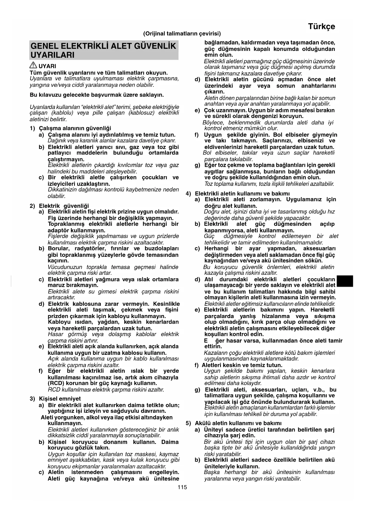 a) Üniteyi sadece üretici tarafından belirtilen şarj cihazıyla şarj edin. Bir akü ünitesi tipi için uygun olan bir şarj cihazı başka tipte bir akü ünitesiyle kullanıldığında yangın riski yaratabilir. b) Elektrikli aletleri sadece özellikle belirtilen akü üniteleriyle kullanın. Başka herhangi bir akü ünitesinin kullanılması yaralanma veya yangın riski yaratabilir. GENEL ELEKTRİKLİ ALET GÜVENLİK UYARILARI UYARI Tüm güvenlik uyarılarını ve tüm talimatları okuyun. Uyarılara ve talimatlara uyulmaması elektrik çarpmasına, yangına ve/veya ciddi yaralanmaya neden olabilir. Bu kılavuzu gelecekte başvurmak üzere saklayın. Uyarılarda kullanılan “elektrikli alet” terimi, şebeke elektriğiyle çalışan (kablolu) veya pille çalışan (kablosuz) elektrikli aletinizi belirtir.