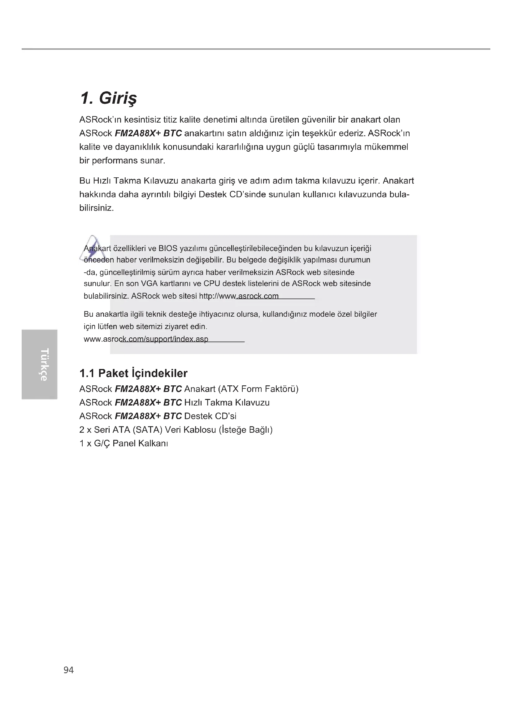 ASRock’ın kesintisiz titiz kalite denetimi altında üretilen güvenilir bir anakart olan ASRock FM2A88X+ BTC anakartını satın aldığınız için teşekkür ederiz. ASRock’ın kalite ve dayanıklılık konusundaki kararlılığına uygun güçlü tasarımıyla mükemmel bir performans sunar. Bu Hızlı Takma Kılavuzu anakarta giriş ve adım adım takma kılavuzu içerir. Anakart hakkında daha ayrıntılı bilgiyi Destek CD’sinde sunulan kullanıcı kılavuzunda bula- bilirsiniz. Anakart özellikleri ve BIOS yazılımı güncelleştirilebileceğinden bu kılavuzun içeriği önceden haber verilmeksizin değişebilir. Bu belgede değişiklik yapılması durumun -da, güncelleştirilmiş sürüm ayrıca haber verilmeksizin ASRock web sitesinde sunulur. En son VGA kartlarını ve CPU destek listelerini de ASRock web sitesinde bulabilirsiniz. ASRock web sitesi http://www.asrock.com Bu anakartla ilgili teknik desteğe ihtiyacınız olursa, kullandığınız modele özel bilgiler için lütfen web sitemizi ziyaret edin. www.asrock.com/support/index.asp