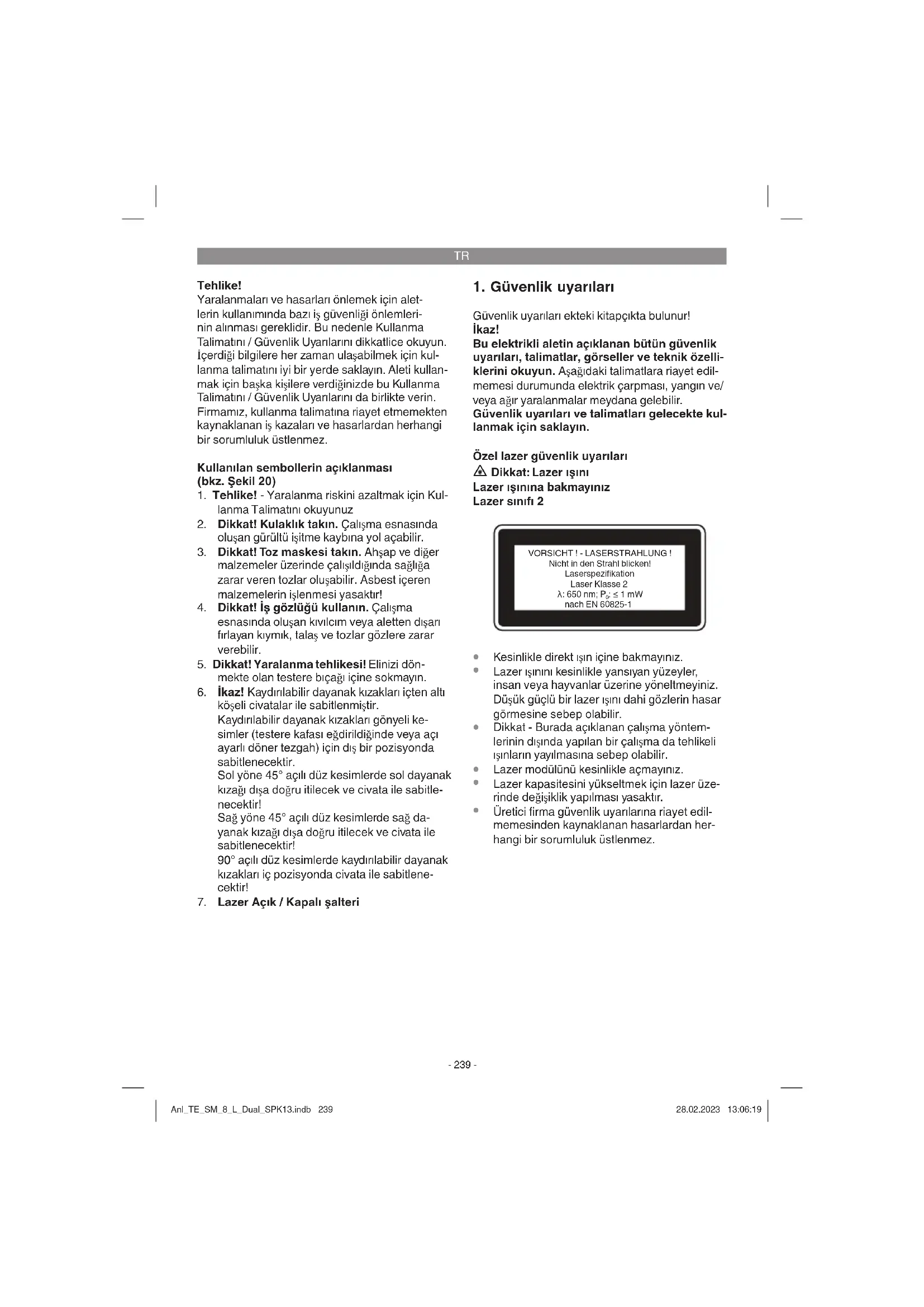 Güvenlik uyarıları ekteki kitapçıkta bulunur! İkaz! Bu elektrikli aletin açıklanan bütün güvenlik uyarıları, talimatlar, görseller ve teknik özelli- klerini okuyun. Aşağıdaki talimatlara riayet edil- memesi durumunda elektrik çarpması, yangın ve/ veya ağır yaralanmalar meydana gelebilir. Güvenlik uyarıları ve talimatları gelecekte kul- lanmak için saklayın. Özel lazer güvenlik uyarıları Dikkat: Lazer ışını Lazer ışınına bakmayınız Lazer sınıfı 2 VORSICHT ! - LASERSTRAHLUNG ! Nicht in den Strahl blicken! Laserspezifikation Laser Klasse 2 Ǹ: 650 nm; P