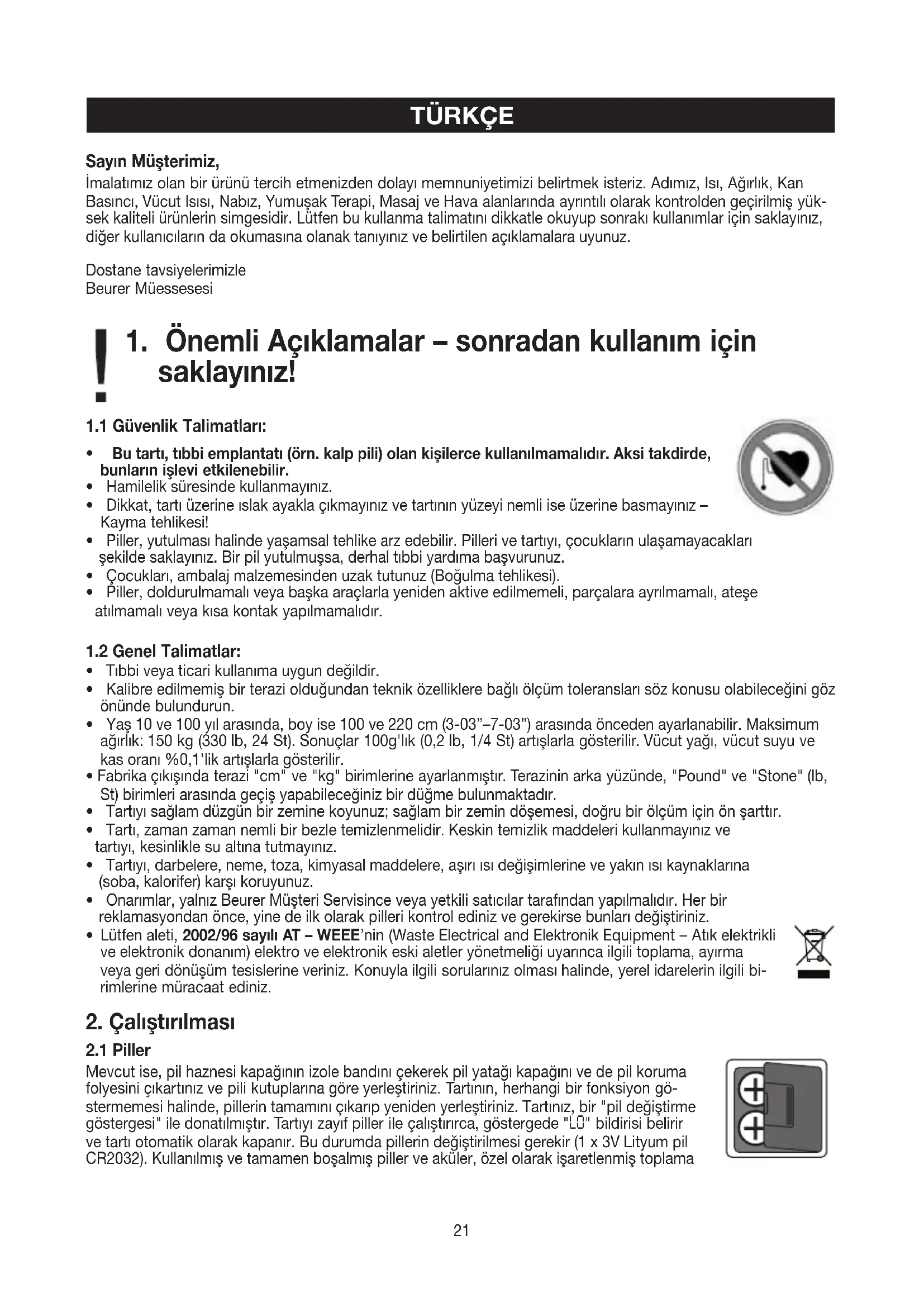 Sayın Müşterimiz, İmalatımız olan bir ürünü tercih etmenizden dolayı memnuniyetimizi belirtmek isteriz. Adımız, Isı, Ağırlık, Kan Basıncı,VücutIsısı,Nabız,YumuşakTerapi,MasajveHavaalanlarındaayrıntılıolarakkontroldengeçirilmişyük- sekkaliteliürünlerinsimgesidir.Lütfenbukullanmatalimatınıdikkatleokuyupsonrakıkullanımlariçinsaklayınız, diğerkullanıcılarındaokumasınaolanaktanıyınızvebelirtilenaçıklamalarauyunuz. Dostane tavsiyelerimizle Beurer Müessesesi