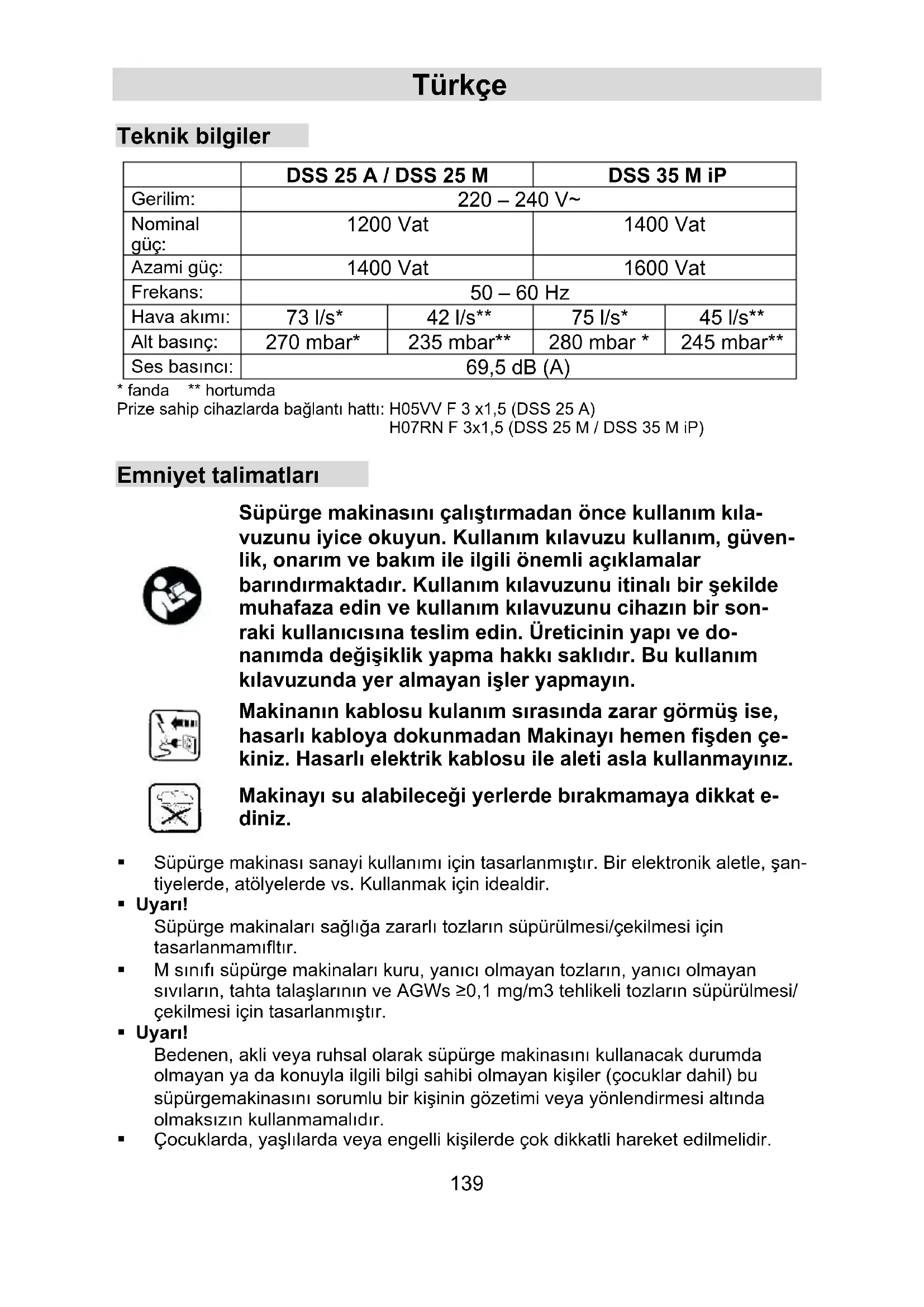 - fanda ** hortumda Prize sahip cihazlarda bağlantı hattı: H05VV F 3 x1,5 (DSS 25 A) H07RN F 3x1,5 (DSS 25 M / DSS 35 M iP) Emniyet talimatları