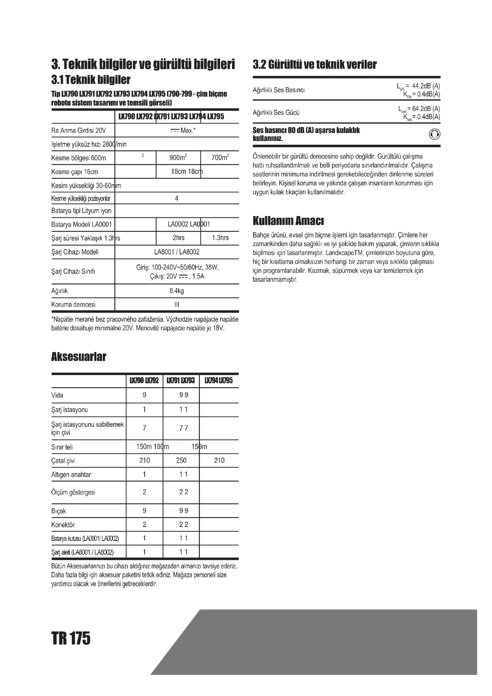 = 0.4dB(A) Ses basıncı 80 dB (A) aşarsa kulaklık kullanınız. Önlenebilir bir gürültü derecesine sahip değildir. Gürültülü çalışma hattı ruhsatlandırılmalı ve belli periyotlarla sınırlandırılmalıdır. Çalışma saatlerinin minimuma indirilmesi gerekebileceğinden dinlenme süreleri belirleyin. Kişisel koruma ve yakında çalışan insanların korunması için uygun kulak tıkaçları kullanılmalıdır. Kullanım Amacı Bahçe ürünü, evsel çim biçme işlemi için tasarlanmıştır. Çimlere her zamankinden daha sağlıklı ve iyi şekilde bakım yaparak, çimlerin sıklıkla biçilmesi için tasarlanmıştır. LandxcapeTM, çimlerinizin boyutuna göre, hiç bir kısıtlama olmaksızın herhangi bir zaman veya sıklıkta çalışması için programlanabilir. Kazmak, süpürmek veya kar temizlemek için tasarlanmamıştır.TR176
