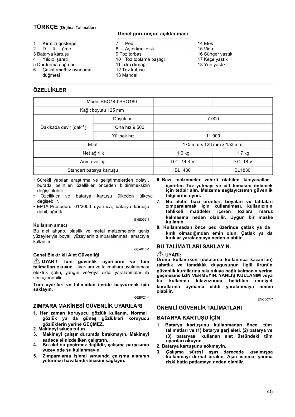 - EPTA-Prosedürü 01/2003 uyarınca, batarya kartuşu dahil, ağırlık ENE052-1 Kullanım amacı Bu alet ahşap, plastik ve metal malzemelerin geniş yüzeyleriyle boyalı yüzeylerin zımparalanması amacıyla kullanılır. GEA010-1 Genel Elektrikli Alet Güvenliği UYARI! Tüm güvenlik uyarılarını ve tüm talimatları okuyun. Uyarılara ve talimatlara uyulmaması elektrik şoku, yangın ve/veya ciddi yaralanmalar ile sonuçlanabilir. Tüm uyarıları ve talimatları ileride başvurmak için saklayın. GEB021-4 ZIMPARA MAKİNESİ GÜVENLİK UYARILARI