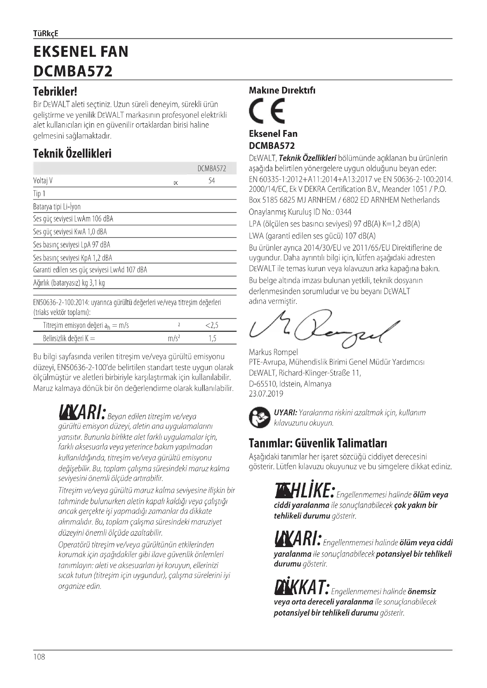 VARNING: Eftersom andra tillbehör än de som erbjuds av DeWALT inte har testats med denna produkt, kan användningen av sådana tillbehör med detta verktyg vara riskabelt. För att minska risken för personskada bör endast tillbehör som rekommenderas av DeWALT användas med dennaprodukt. Rådfråga din återförsäljare för vidare information angående lämpligatillbehör.108 TüRkçE Makıne Dırektıfı Eksenel Fan DCMBA572 DeWALT, Teknik Özellikleri bölümünde açıklanan bu ürünlerin aşağıda belirtilen yönergelere uygun olduğunu beyan eder: EN 60335-1:2012+A11:2014+A13:2017 ve EN 50636-2-100:2014. 2000/14/EC, Ek V DEKRA Certification B.V., Meander 1051 / P.O. Box 5185 6825 MJ ARNHEM / 6802 ED ARNHEM Netherlands Onaylanmış Kuruluş ID No.: 0344 LPA (ölçülen ses basıncı seviyesi) 97 dB(A) K=1,2 dB(A)LWA (garanti edilen ses gücü) 107 dB(A)Bu ürünler ayrıca 2014/30/EU ve 2011/65/EU Direktiflerine de uygundur. Daha ayrıntılı bilgi için, lütfen aşağıdaki adresten DeWALT ile temas kurun veya kılavuzun arka kapağınabakın.Bu belge altında imzası bulunan yetkili, teknik dosyanın derlenmesinden sorumludur ve bu beyanı DeWALT adınavermiştir.Markus Rompel PTE-Avrupa, Mühendislik Birimi Genel Müdür Yardımcısı DeWALT, Richard-Klinger-Straße 11, D-65510, Idstein, Almanya 23.07.2019Bu bilgi sayfasında verilen titreşim ve/veya gürültü emisyonu düzeyi, EN50636-2-100’de belirtilen standart teste uygun olarak ölçülmüştür ve aletleri birbiriyle karşılaştırmak için kullanılabilir. Maruz kalmaya dönük bir ön değerlendirme olarakkullanılabilir.