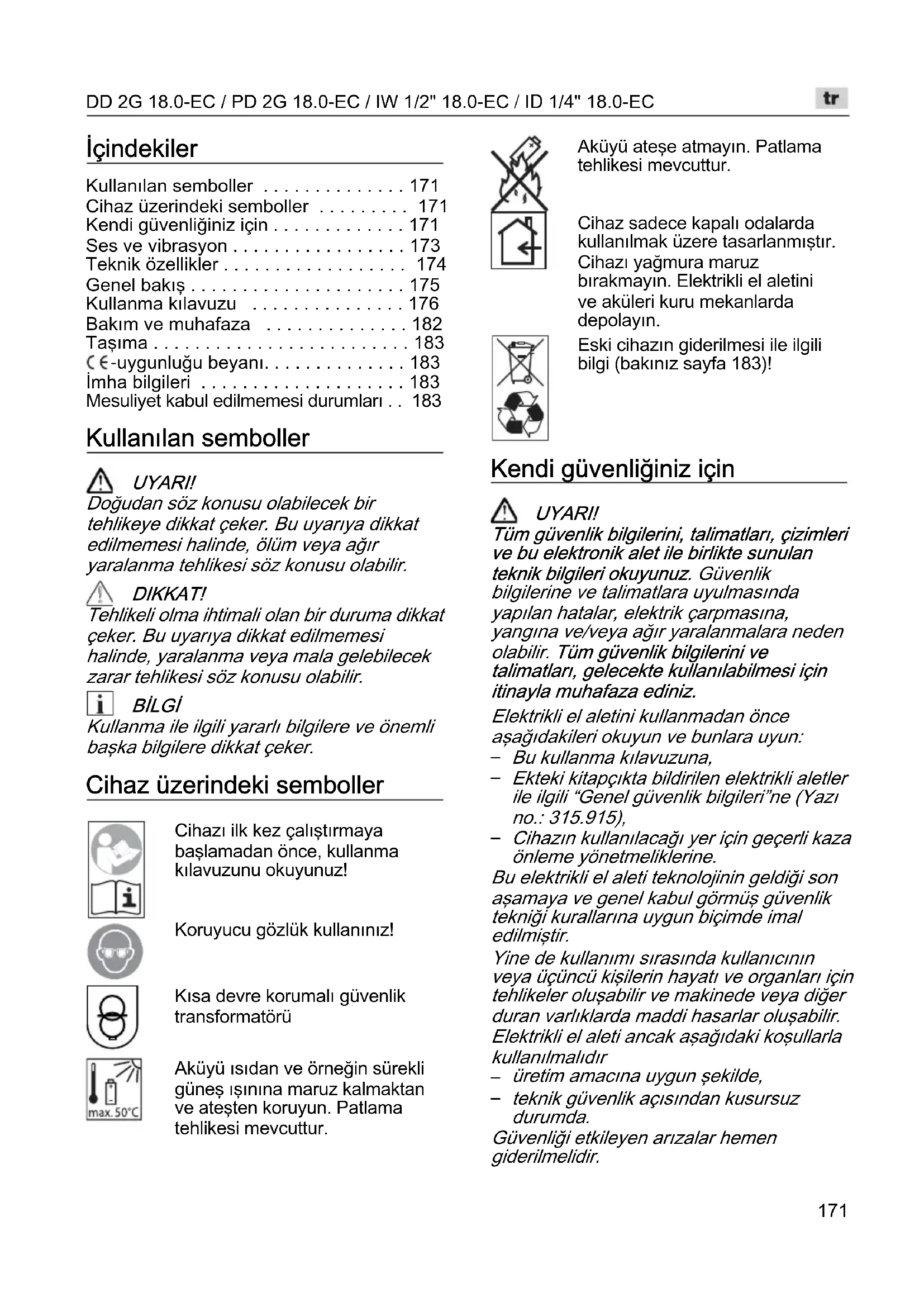 - Mesuliyet kabul edilmemesi durumları Kullanılan semboller UYARI! Doğudan söz konusu olabilecek bir tehlikeye dikkat çeker. Bu uyarıya dikkat edilmemesi halinde, ölüm veya ağır yaralanma tehlikesi söz konusu olabilir. DIKKAT! Tehlikeli olma ihtimali olan bir duruma dikkat çeker. Bu uyarıya dikkat edilmemesi halinde, yaralanma veya mala gelebilecek zarar tehlikesi söz konusu olabilir. BİLGİ Kullanma ile ilgili yararlı bilgilere ve önemli başka bilgilere dikkat çeker. Cihaz üzerindeki semboller Cihazı ilk kez çalıştırmaya başlamadan önce, kullanma kılavuzunu okuyunuz! Koruyucu gözlük kullanınız! Kısa devre korumalı güvenlik transformatörü Aküyü ısıdan ve örneğin sürekli güneş ışınına maruz kalmaktan ve ateşten koruyun. Patlama tehlikesi mevcuttur. Aküyü ateşe atmayın. Patlama tehlikesi mevcuttur. Cihaz sadece kapalı odalarda kullanılmak üzere tasarlanmıştır. Cihazı yağmura maruz bırakmayın. Elektrikli el aletini ve aküleri kuru mekanlarda depolayın. Eski cihazın giderilmesi ile ilgili bilgi (bakınız sayfa 183)! Kendi güvenliğiniz için UYARI! Tüm güvenlik bilgilerini, talimatları, çizimleri ve bu elektronik alet ile birlikte sunulan teknik bilgileri okuyunuz. Güvenlik bilgilerine ve talimatlara uyulmasında yapılan hatalar, elektrik çarpmasına, yangına ve/veya ağır yaralanmalara neden olabilir. Tüm güvenlik bilgilerini ve talimatları, gelecekte kullanılabilmesi için itinayla muhafaza ediniz. Elektrikli el aletini kullanmadan önce aşağıdakileri okuyun ve bunlara uyun: p. 183