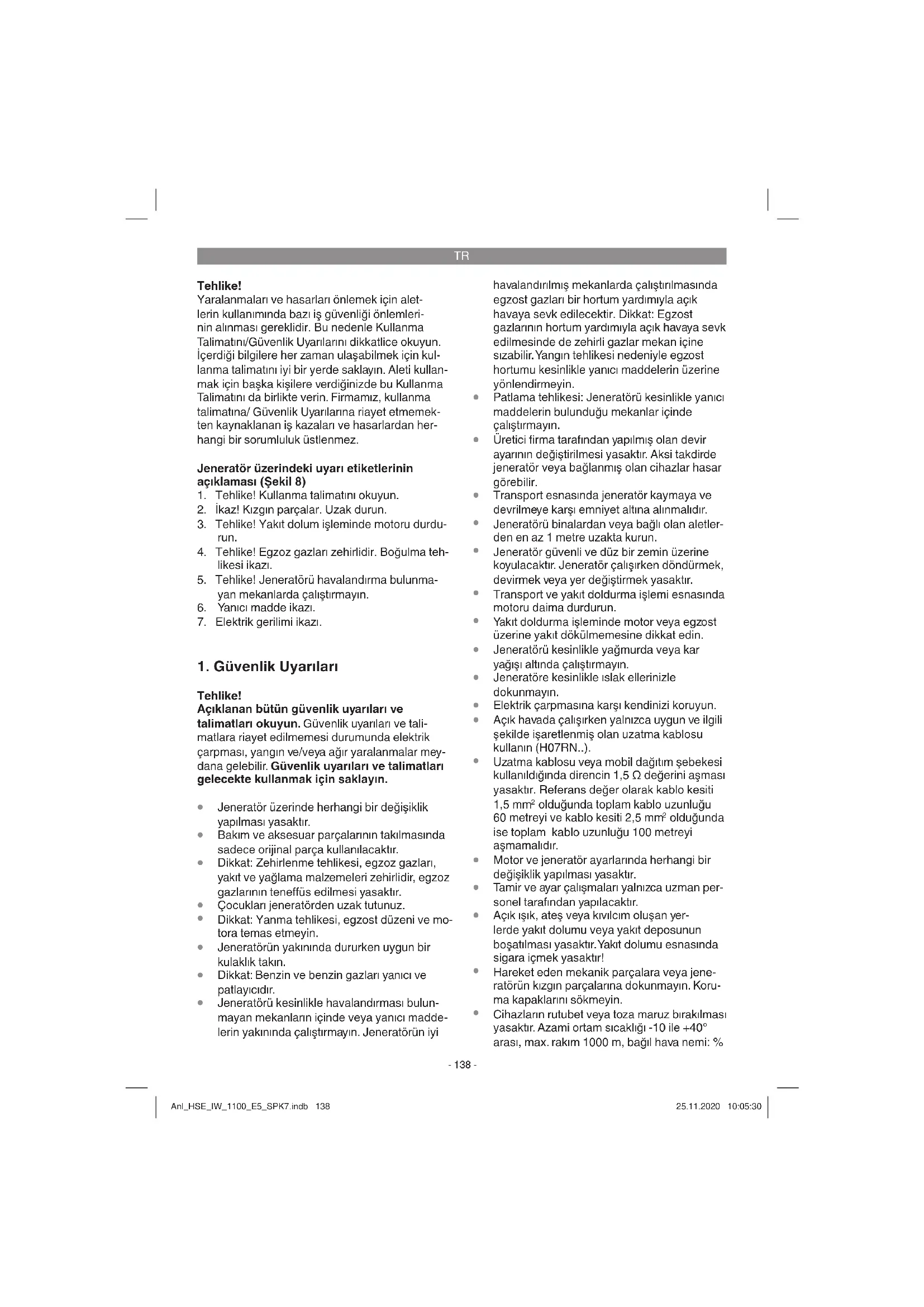 /Sapma K ........................... .......................................... 95 dB (A)/1,52 dB(A) Güç faktörü cos ϕ: ........................................... 1 Güç sınıfı: ........................................................G1 Sıcaklık max: .............................................. 40°C Maks. kurulum rakımı (Deniz seviyesi): .... 1000 m Buji: .......................................................LD E6TC İşletme türü S1 (Sürekli çalıştırma) Makine belirtilmiş olan anma güç değeri ile sürekli olarak çalıştırılabilir. Anl_HSE_IW_1100_E5_SPK7.indb 140Anl_HSE_IW_1100_E5_SPK7.indb 140 25.11.2020 10:05:3125.11.2020 10:05:31TR