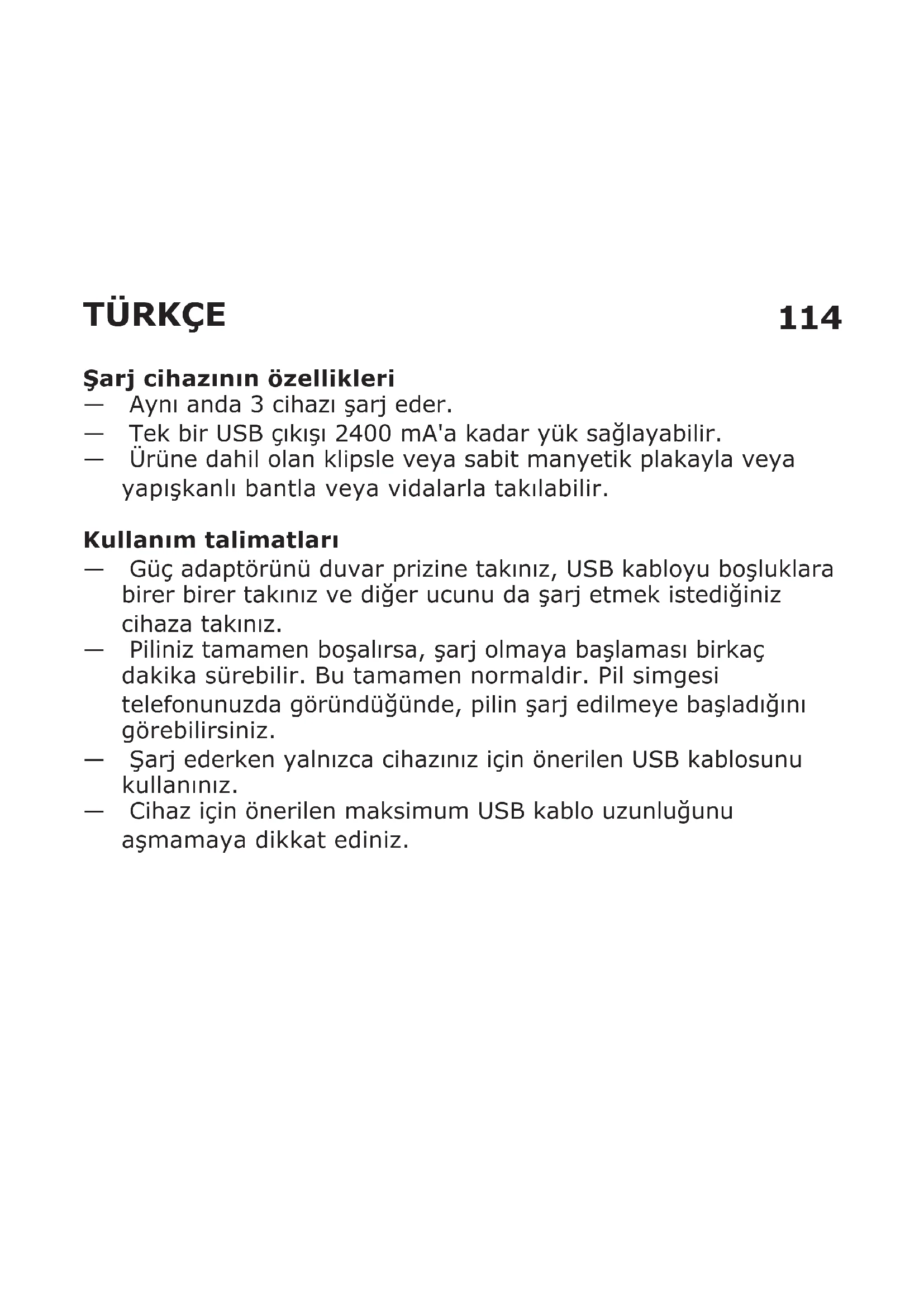 Şarj cihazının özellikleri — Aynı anda 3 cihazı şarj eder. — Tek bir USB çıkışı 2400 mA'a kadar yük sağlayabilir. — Ürüne dahil olan klipsle veya sabit manyetik plakayla veya yapışkanlı bantla veya vidalarla takılabilir. Kullanım talimatları — Güç adaptörünü duvar prizine takınız, USB kabloyu boşluklara birer birer takınız ve diğer ucunu da şarj etmek istediğiniz cihaza takınız. — Piliniz tamamen boşalırsa, şarj olmaya başlaması birkaç dakika sürebilir. Bu tamamen normaldir. Pil simgesi telefonunuzda göründüğünde, pilin şarj edilmeye başladığını görebilirsiniz. — Şarj ederken yalnızca cihazınız için önerilen USB kablosunu kullanınız. — Cihaz için önerilen maksimum USB kablo uzunluğunu aşmamaya dikkat ediniz.115 Bilmekte fayda var — USB kablosunun uzunluğu ve kalitesi, şarj hızını ve performansını etkiler. — Şarj sırasında cihazlar ısınabilir; bu tamamen normaldir ve tamamen şarj olduktan sonra yavaş yavaş soğuyacaklardır. — Şarj etme süresi cihazın pil kapasitesine, şarj seviyesine, pilin yaşına ve çevredeki sıcaklığa bağlı olarak değişiklik gösterebilir. — Şarj cihazı saklama sıcaklığı: -20°C - 25°C — Şarj aleti çalışma sıcaklığı: 0°C - 40°C Temizlemeden önce ve kullanılmadığında şarj cihazını güç kaynağından çıkarınız. Şarj cihazını temizlemek için nemli bir bezle siliniz. Şarj cihazını kesinlikle suya batırmayınız. Önerilen ihtiyati tedbirler ve teknik veriler için şarj cihazının arkasına bakınız. Bu talimatları ileride kullanmak üzere saklayınız.116 UYARI: — Duvar prizinin ekipmanın yakınında bulunması ve kolayca erişilebilir olması gerekir. — Sadece kuru ortamlarda kullanınız. — Çocukların ürünle oynamamalarını sağlamak için denetlenmelidirler. — Kablo hasar görürse cihaz kullanılmadan atılmalıdır. — Hasarlı veya hatalı USB kablosunu şarj etmek için kesinlikle kullanmayınız, aksi halde cihazlara zarar verebilir. Ürün servisi Kapakların açılması veya sökülmesi sizi tehlikeli voltaj noktalarına götürebileceğinden veya diğer risklere maruz bırakabileceğinden, bu ürünü kendiniz tamir etmeye çalışmayınız.117