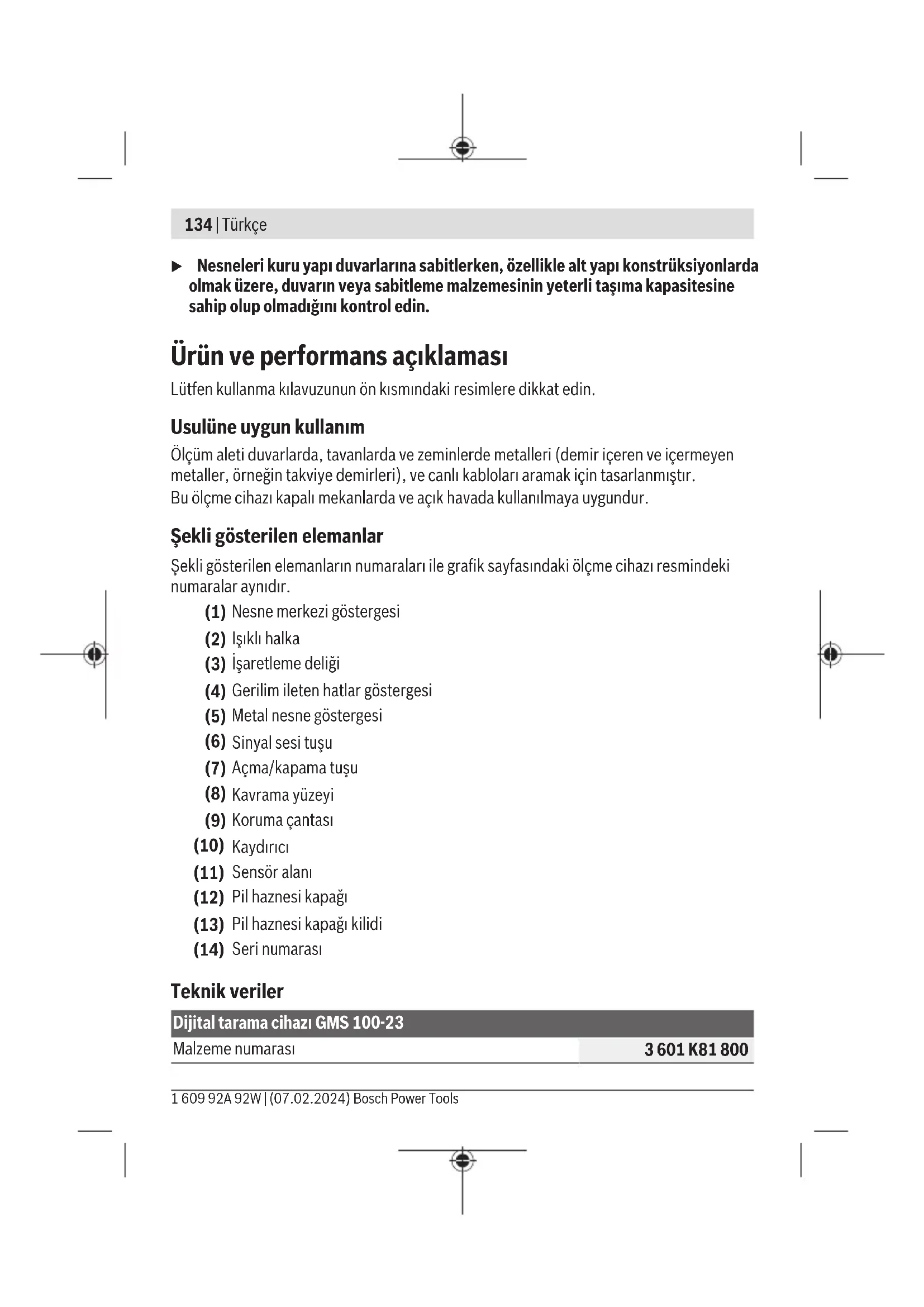 Τα όργανα μέτρησης, οι επαναφορτιζόμενες μπαταρίες/μπαταρίες, τα εξαρτήματα και οι συσκευασίες πρέπει να ανακυκλώνονται με τρόπο φιλικό προς το περιβάλλον. Μη ρίχνετε τα όργανα μέτρησης και τις μπαταρίες στα οικιακά απορρίμματα! 1 609 92A 92W | (07.02.2024) Bosch Power ToolsTürkçe | 133 Μόνο για χώρες τηςΕΕ: Σύμφωνα με την Ευρωπαϊκή οδηγία 2012/19/ΕΕ σχετικά με τις παλιές ηλεκτρικές και ηλε- κτρονικές συσκευές και τη μεταφορά της οδηγίας αυτής σε εθνικό δίκαιο τα άχρηστα όργα- να μέτρησης και σύμφωνα με την Ευρωπαϊκή οδηγία 2006/66/ΕΚ οι χαλασμένες ή χρησι- μοποιημένες μπαταρίες πρέπει να συλλέγονται ξεχωριστά, για να ανακυκλωθούν με τρόπο φιλικό προς το περιβάλλον. Σε περίπτωση μη ενδεδειγμένης απόσυρσης οι ηλεκτρικές και ηλεκτρονικές συσκευές λόγω ενδεχομένης παρουσίας επικίνδυνων ουσιών μπορούν να έχουν επιβλαβείς επιπτώσεις στο περιβάλλον και στην ανθρώπινη υγεία. Türkçe Güvenlik talimatı Bütün talimat ve uyarılar okunmalı ve bunlara uyulmalıdır. Ölçme cihazı bu güvenlik talimatına uygun olarak kullanılmazsa, ölçme cihazına entegre koruyucu donanımların işlevi kısıtlanabilir. BU TALİMATI İYİ VE GÜVENLİ BİR YERDE SAKLAYIN. u Ölçme cihazının sadece kalifiye uzman personel tarafından ve orijinal yedek parçalarla onarılmasını sağlayın. Bu sayede ölçme cihazının güvenliğini sağlarsınız. u Ölçme cihazı ile içinde yanıcı sıvılar, gazlar veya tozlar bulunan patlama riski bulunan ortamlarda çalışmayın. Ölçme cihazı içinde tozu veya buharları tutuşturabilecek kıvılcımlar oluşabilir. u Bu ölçüm aleti teknolojik açıdan yüzde yüzlük bir güvenlik sağlayamaz. Bu nedenle, tehlikeleri önlemek için, duvarda, tavanda veya zeminde yapılacak her delme, kesme veya frezeleme işleminden önce yapı planları, yapım esnasındaki fotoğraflar gibi diğer bilgi kaynaklarına da başvurun. Nem veya güçlü elektrik, manyetik veya elektromanyetik alanlar oluşturan diğer elektrikli aletlere yakınlık, ıslaklık, metal içeren yapı malzemeleri, alüminyum lamine yalıtım malzemeleri ve iletken duvar kağıdı veya fayanslar gibi çevresel etkiler ölçme aletinin hassasiyetini etkileyebilir. Nesnelerin sayısı, türü, boyutu ve konumu ölçüm sonuçlarını tahrif edebilir. u Binada gaz tesisatı boruları bulunuyorsa, duvarlarda, tavanlarda veya zeminde çalışma yaptıktan sonra her defasında gaz borularında bir hasar olup olmadığını kontrol edin. Bosch Power Tools 1 609 92A 92W | (07.02.2024)134 | Türkçe u Nesneleri kuru yapı duvarlarına sabitlerken, özellikle alt yapı konstrüksiyonlarda olmak üzere, duvarın veya sabitleme malzemesinin yeterli taşıma kapasitesine sahip olup olmadığını kontrol edin. Ürün ve performans açıklaması Lütfen kullanma kılavuzunun ön kısmındaki resimlere dikkat edin. Usulüne uygun kullanım Ölçüm aleti duvarlarda, tavanlarda ve zeminlerde metalleri (demir içeren ve içermeyen metaller, örneğin takviye demirleri), ve canlı kabloları aramak için tasarlanmıştır. Bu ölçme cihazı kapalı mekanlarda ve açık havada kullanılmaya uygundur. Şekli gösterilen elemanlar Şekli gösterilen elemanların numaraları ile grafik sayfasındaki ölçme cihazı resmindeki numaralar aynıdır. (1) Nesne merkezi göstergesi (2) Işıklı halka (3) İşaretleme deliği (4) Gerilim ileten hatlar göstergesi (5) Metal nesne göstergesi (6) Sinyal sesi tuşu (7) Açma/kapama tuşu (8) Kavrama yüzeyi (9) Koruma çantası (10) Kaydırıcı (11) Sensör alanı (12) Pil haznesi kapağı (13) Pil haznesi kapağı kilidi (14) Seri numarası Teknik veriler Dijital tarama cihazı GMS100-23 Malzeme numarası 3601K81800 1 609 92A 92W | (07.02.2024) Bosch Power ToolsTürkçe | 135 Dijital tarama cihazı GMS100-23 Maks. algılama derinliği