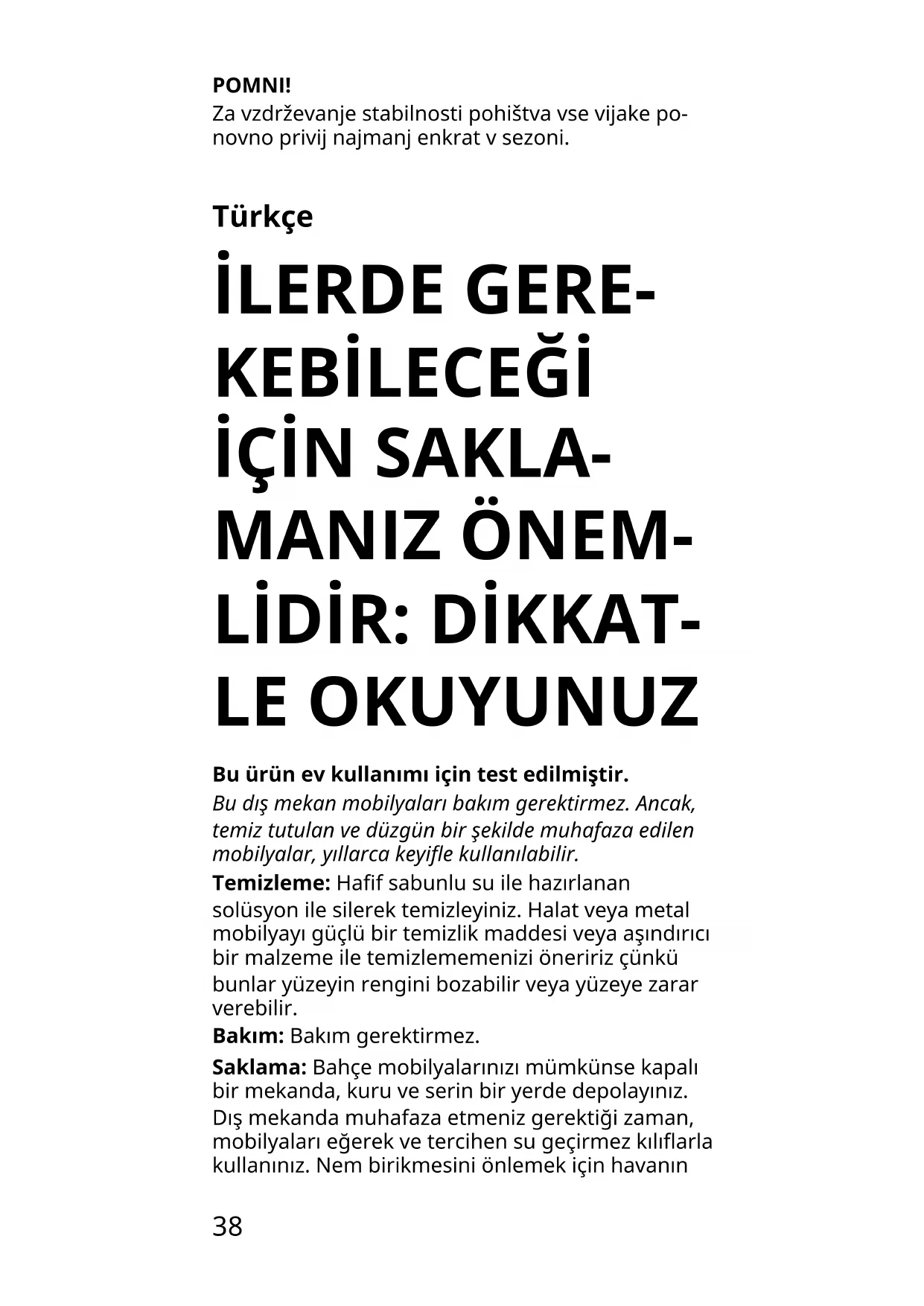 LE OKUYUNUZ Buürünevkullanımıiçintestedilmiştir. Bu dış mekan mobilyaları bakım gerektirmez. Ancak, temiz tutulan ve düzgün bir şekilde muhafaza edilen mobilyalar, yıllarca keyie kullanılabilir. Temizleme: Haf sabunlu su ile hazırlanan solüsyon ile silerek temizleyiniz. Halat veya metal mobilyayı güçlü bir temizlik maddesi veya aşındırıcı bir malzeme ile temizlememenizi öneririz çünkü bunlar yüzeyin rengini bozabilir veya yüzeye zarar verebilir. Bakım: Bakım gerektirmez. Saklama: Bahçe mobilyalarınızı mümkünse kapalı bir mekanda, kuru ve serin bir yerde depolayınız. Dış mekanda muhafaza etmeniz gerektiği zaman, mobilyaları eğerek ve tercihen su geçirmez kılıarla kullanınız. Nem birikmesini önlemek için havanın39 dolaşabildiğinden emin olun. Dondurucu soğuk- larda, plastik zayıayabilir ve kullanım için tavsiye edilmez. Onarım:Çelik, plastik toz boya ile paslanmaya karşı korunur. Herhangi bir nedenle boya kabarır ve kalkarsa çelik korunmasız kalır ve pas oluşabilir. Oluşan hasarı onarmak için silerek temizleyiniz ve korunmasını sağlamak için tekrar boyayınız. DİKKAT! Mobilyanızın sağlamlığını korumak için vidaları her mevsimde en az bir kez yeniden sıkın.