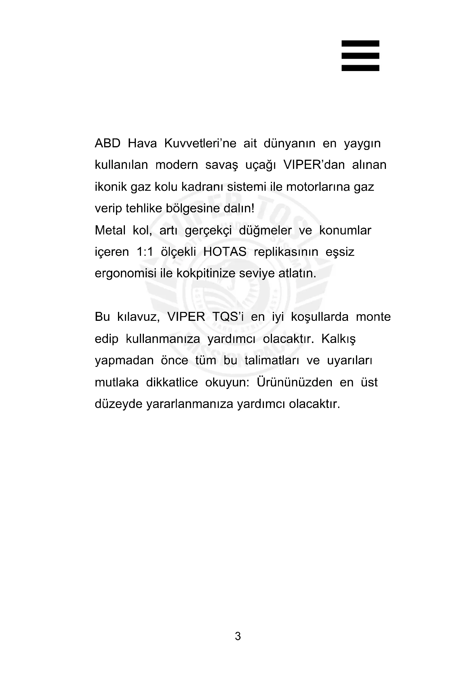 ABD Hava Kuvvetleri’ne ait dünyanın en yaygın kullanılan modern savaş uçağı VIPER’dan alınan ikonik gaz kolu kadranı sistemi ile motorlarına gaz verip tehlike bölgesine dalın! Metal kol, artı gerçekçi düğmeler ve konumlar içeren 1:1 ölçekli HOTAS replikasının eşsiz ergonomisi ile kokpitinize seviye atlatın. Bu kılavuz, VIPER TQS’i en iyi koşullarda monte edip kullanmanıza yardımcı olacaktır. Kalkış yapmadan önce tüm bu talimatları ve uyarıları mutlaka dikkatlice okuyun: Ürününüzden en üst düzeyde yararlanmanıza yardımcı olacaktır.4