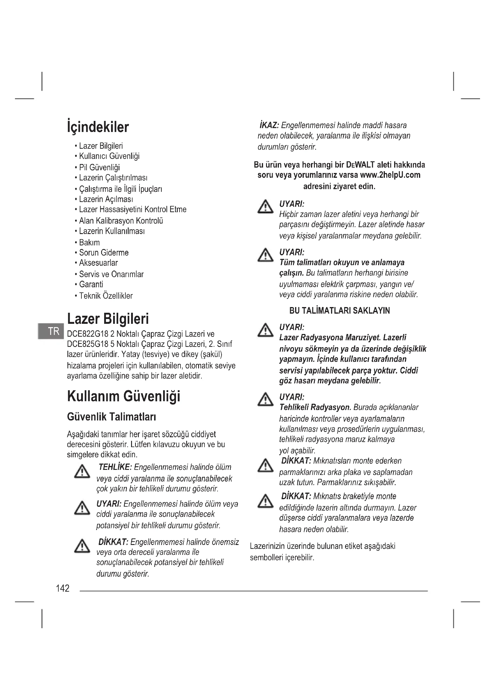 - Teknik Özellikler Lazer Bilgileri DCE822G18 2 Noktalı Çapraz Çizgi Lazeri ve DCE825G18 5 Noktalı Çapraz Çizgi Lazeri, 2. Sınıf lazer ürünleridir. Yatay (tesviye) ve dikey (şakül) hizalama projeleri için kullanılabilen, otomatik seviye ayarlama özelliğine sahip bir lazer aletidir. Kullanım Güvenliği Güvenlik Talimatları Aşağıdaki tanımlar her işaret sözcüğü ciddiyet derecesini gösterir. Lütfen kılavuzu okuyun ve bu simgelere dikkat edin. TEHLİKE: Engellenmemesi halinde ölüm veya ciddi yaralanma ile sonuçlanabilecek çok yakın bir tehlikeli durumu gösterir. UYARI: Engellenmemesi halinde ölüm veya ciddi yaralanma ile sonuçlanabilecek potansiyel bir tehlikeli durumu gösterir. DİKKAT: Engellenmemesi halinde önemsiz veya orta dereceli yaralanma ile sonuçlanabilecek potansiyel bir tehlikeli durumu gösterir. İKAZ: Engellenmemesi halinde maddi hasara neden olabilecek, yaralanma ile ilişkisi olmayan durumları gösterir. Bu ürün veya herhangi bir DEWALT aleti hakkında soru veya yorumlarınız varsa www.2helpU.com adresini ziyaret edin. UYARI: Hiçbir zaman lazer aletini veya herhangi bir parçasını değiştirmeyin. Lazer aletinde hasar veya kişisel yaralanmalar meydana gelebilir. UYARI: Tüm talimatları okuyun ve anlamaya çalışın. Bu talimatların herhangi birisine uyulmaması elektrik çarpması, yangın ve/ veya ciddi yaralanma riskine neden olabilir.